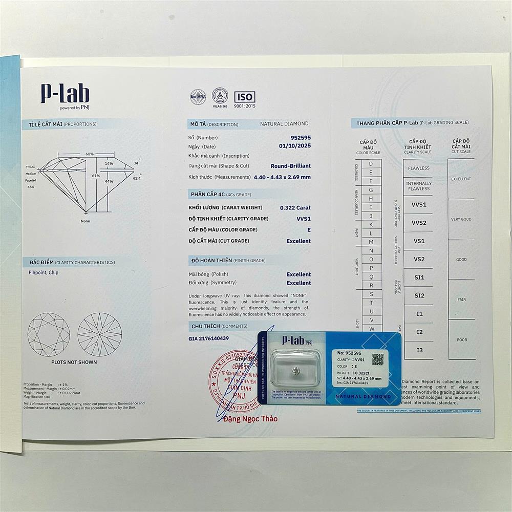 Viên kim cương 4.4LY E/VVS1 sở hữu sắc trắng tinh khiết và độ tinh khiết gần như hoàn hảo, thể hiện vẻ đẹp sang trọng và tinh tế. Phù hợp để chế tác các mẫu nhẫn đơn, dây chuyền hoặc hoa tai thanh lịch. Thiết kế tối giản giúp tôn vinh ánh sáng và vẻ đẹp nổi bật của viên chủ một cách tinh tế và trang nhã.