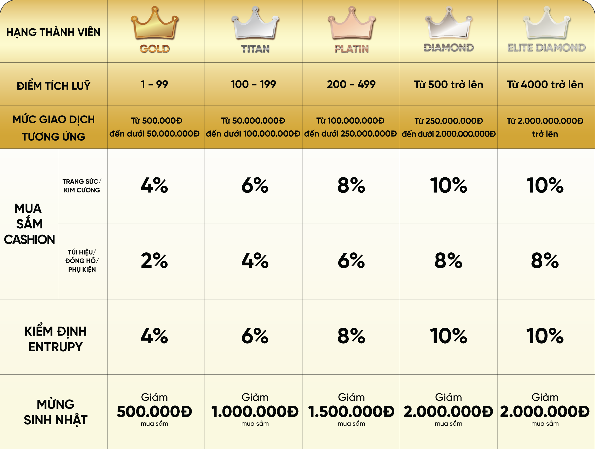 - Khách hàng sẽ nhận được áp dụng ưu đãi mua sắm tại Cashion cho các sản phẩm thuộc dòng Kim cương và Trang sức Kim cương theo phân hạng thành viên tương ứng