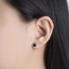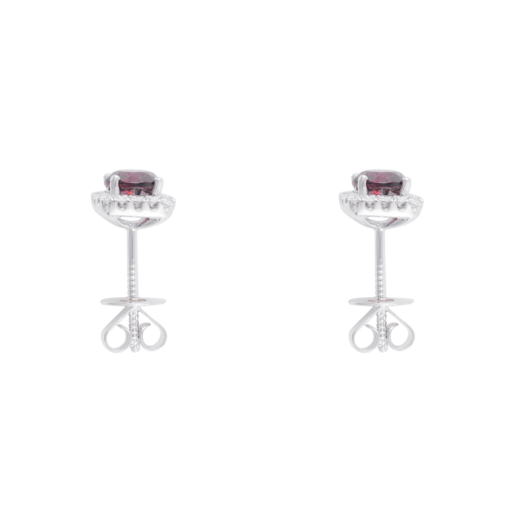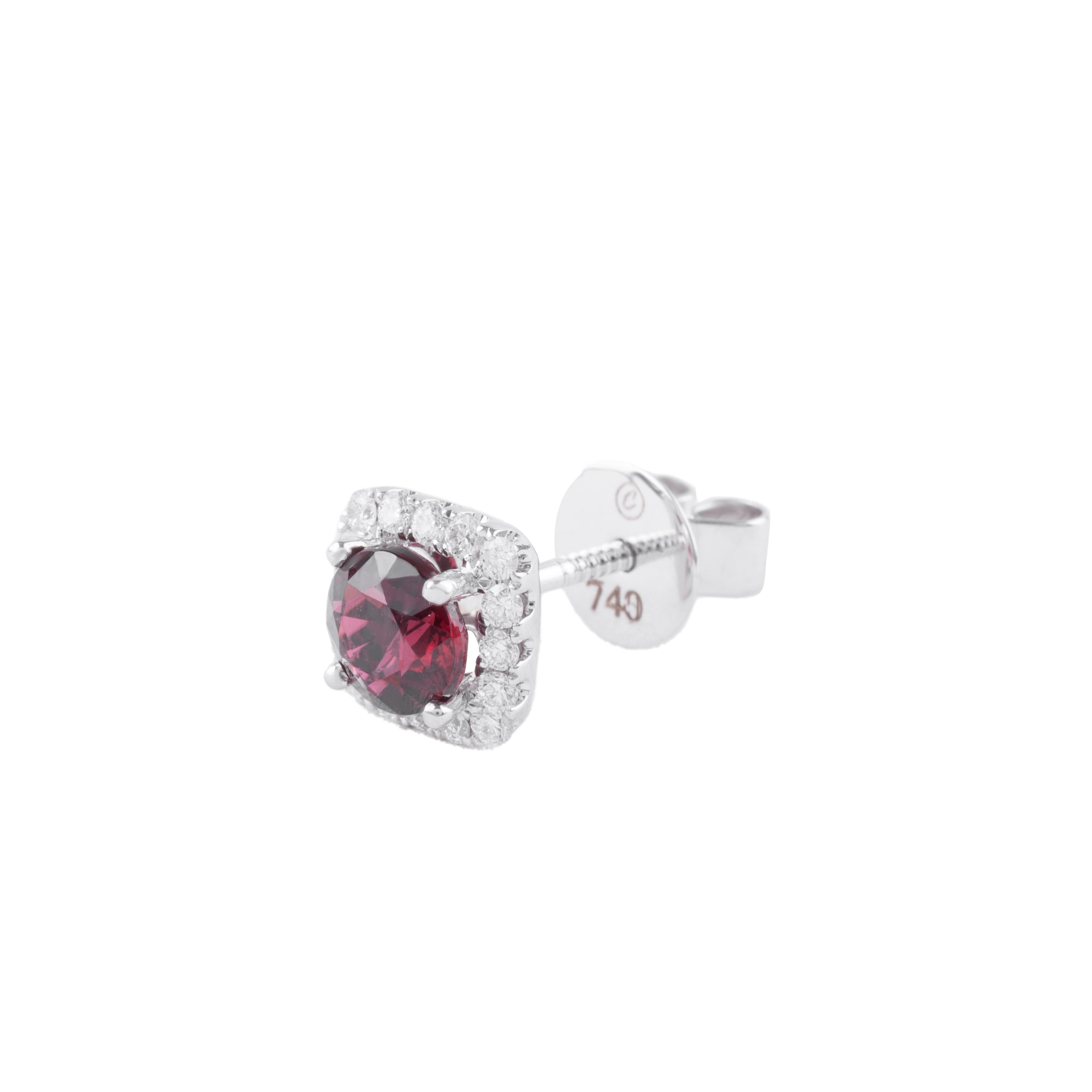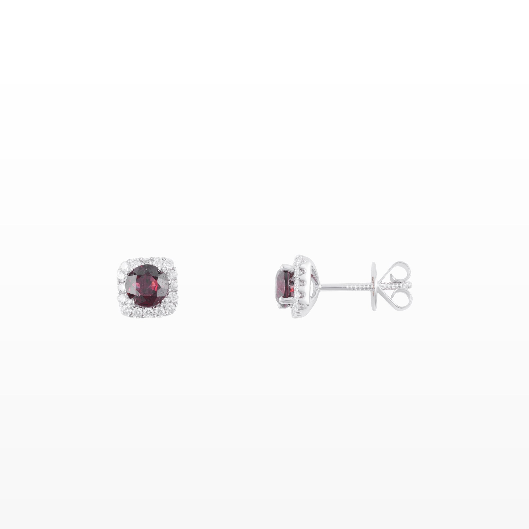 Đôi bông tai đá đỏ kết hợp kim cương dáng halo mang vẻ đẹp quyến rũ và nổi bật. Viên đá chủ sắc đỏ sâu được cắt giác tinh xảo, bao quanh bởi viền kim cương nhỏ lấp lánh, tạo hiệu ứng ánh sáng rực rỡ và tôn lên độ sang trọng của tổng thể.