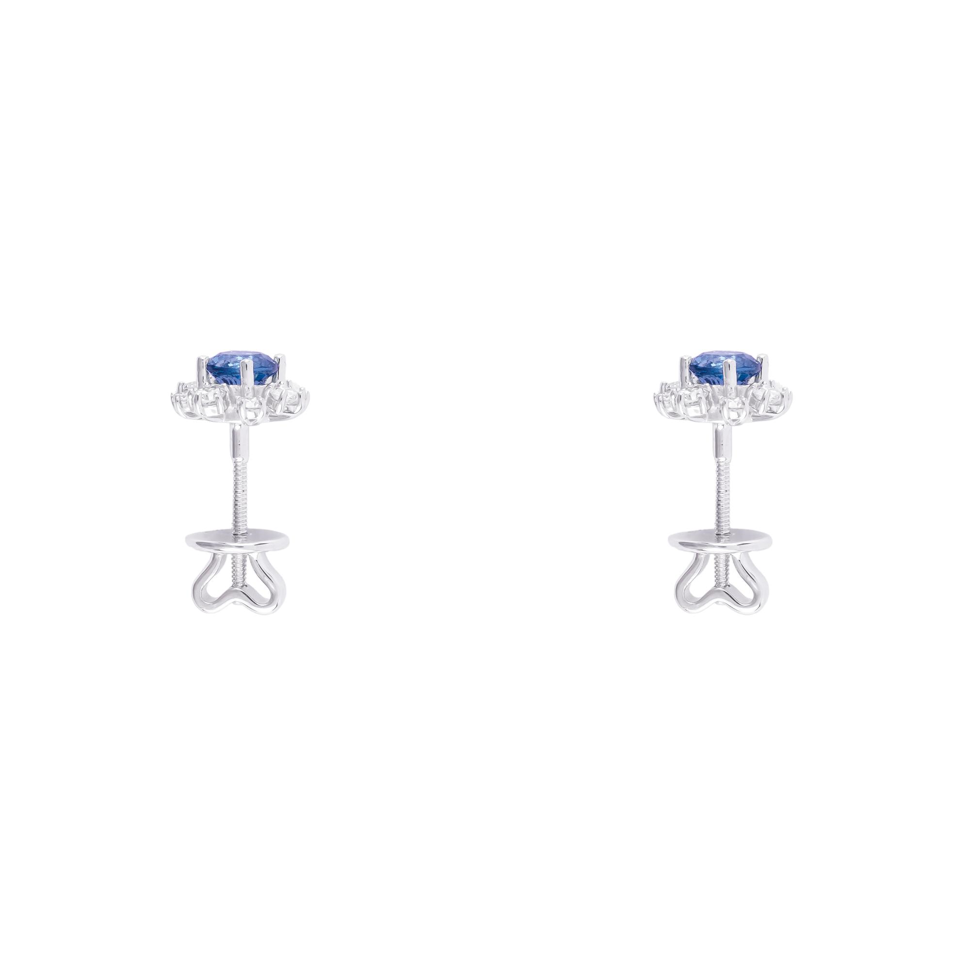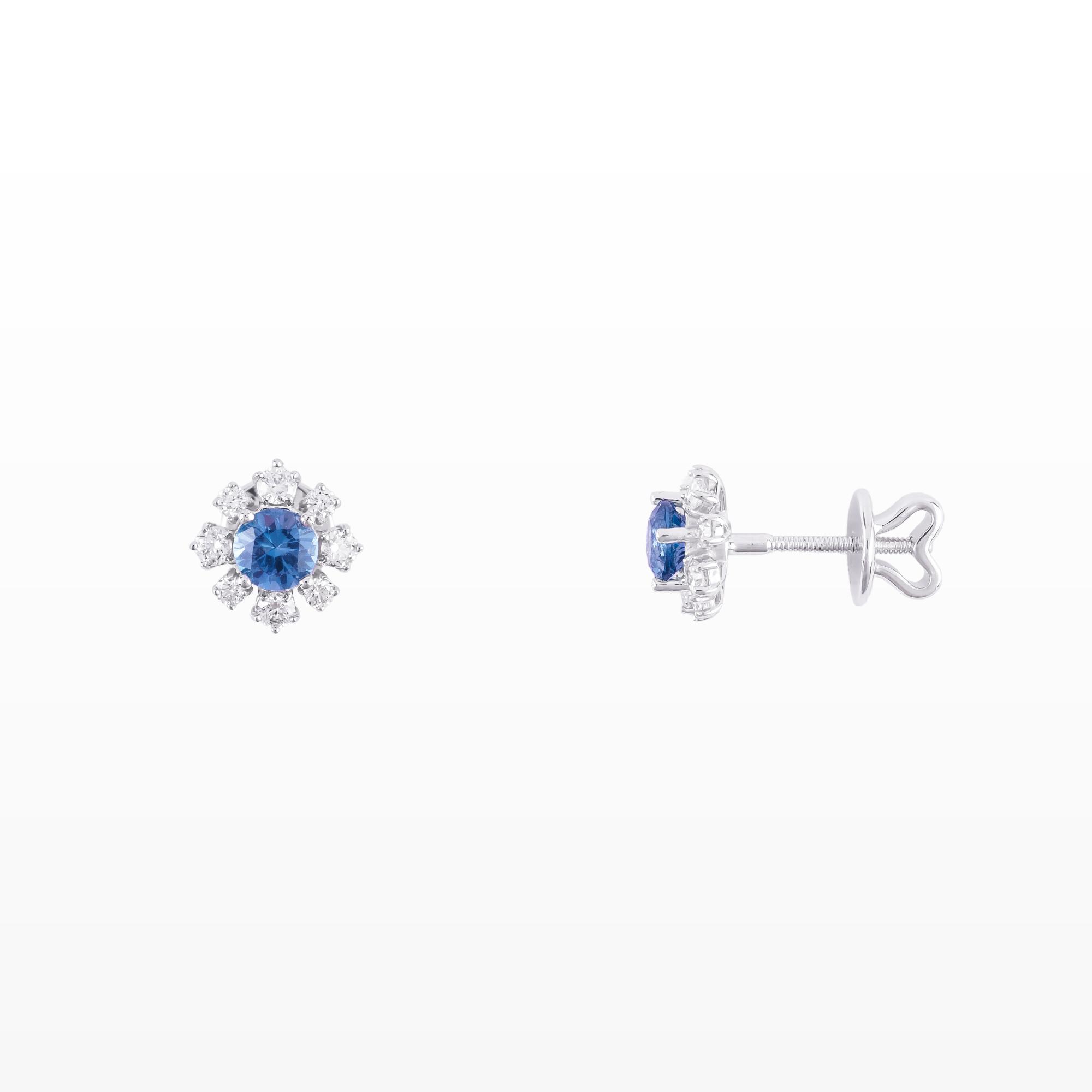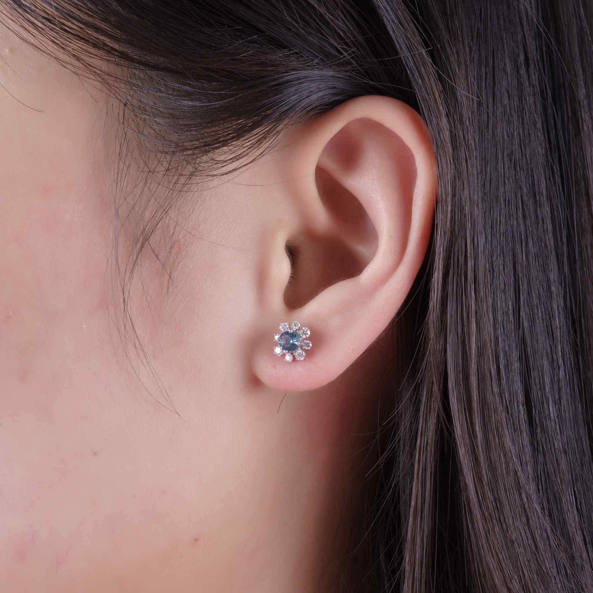 Bông tai vàng trắng nổi bật với viên đá xanh trung tâm được bao quanh bởi vòng kim cương tấm lấp lánh như đóa hoa nhỏ tinh tế. Thiết kế thanh lịch, sang trọng, tạo điểm nhấn cuốn hút cho gương mặt và dễ dàng phối cùng nhiều phong cách trang sức.