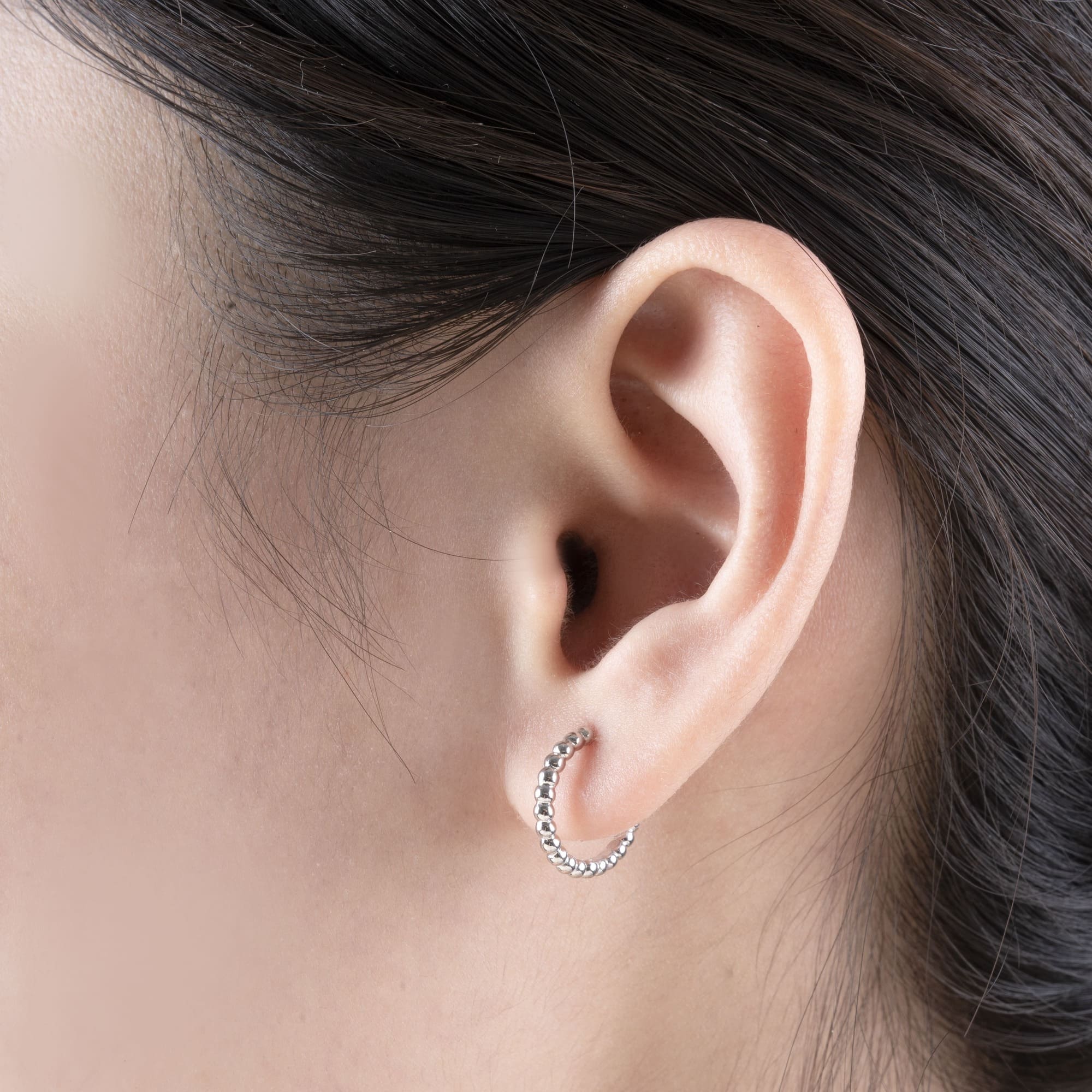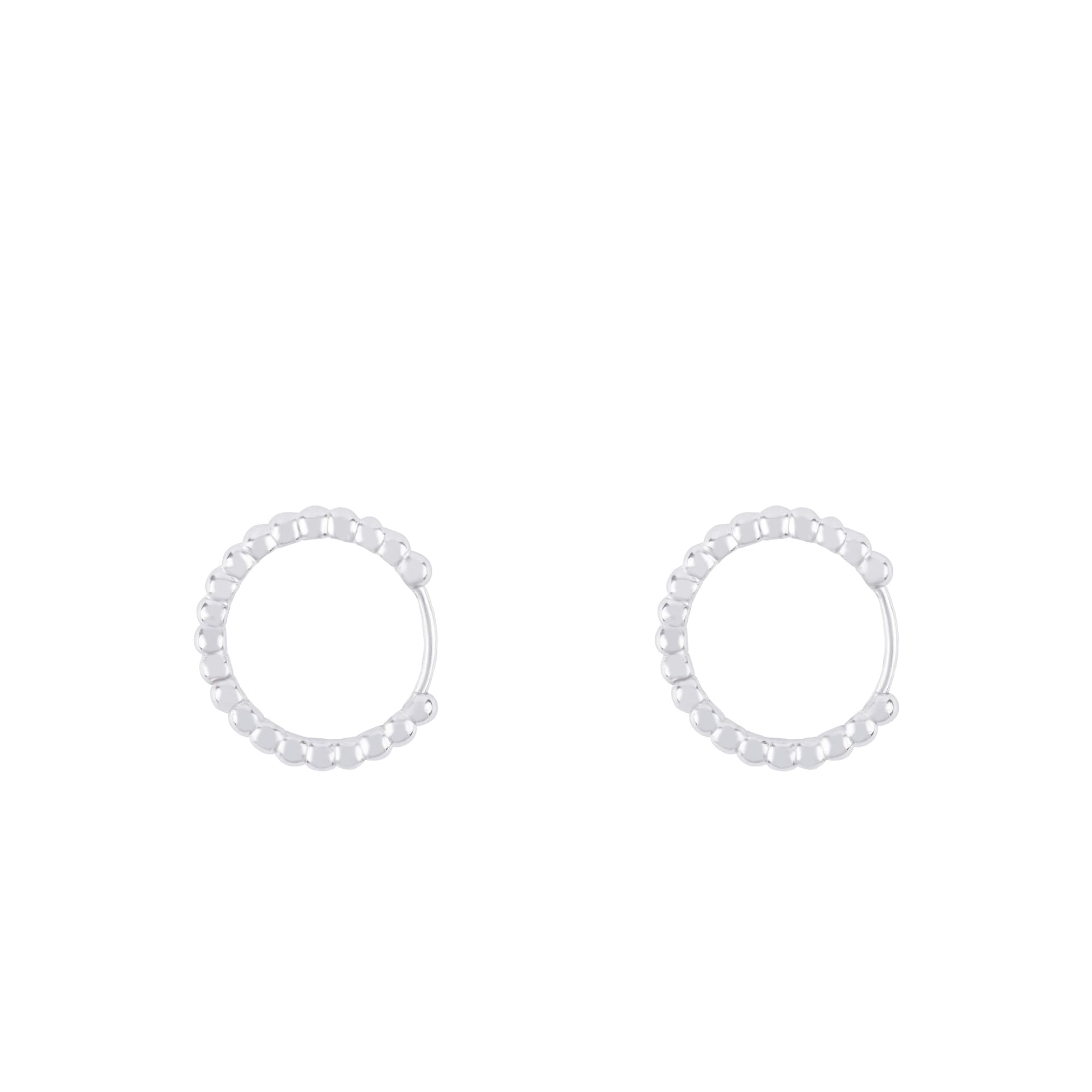 Đôi khuyên tròn hạt bi mang vẻ đẹp tối giản nhưng đầy cá tính, từng hạt bi li ti phản chiếu ánh sáng tinh tế, giúp đôi tai nàng sáng bừng mà không cần quá nhiều chi tiết. Thiết kế ôm sát tai, nhẹ nhàng, tạo cảm giác thoải mái suốt cả ngày – một “must-have” dành cho những cô gái yêu phong cách hiện đại.