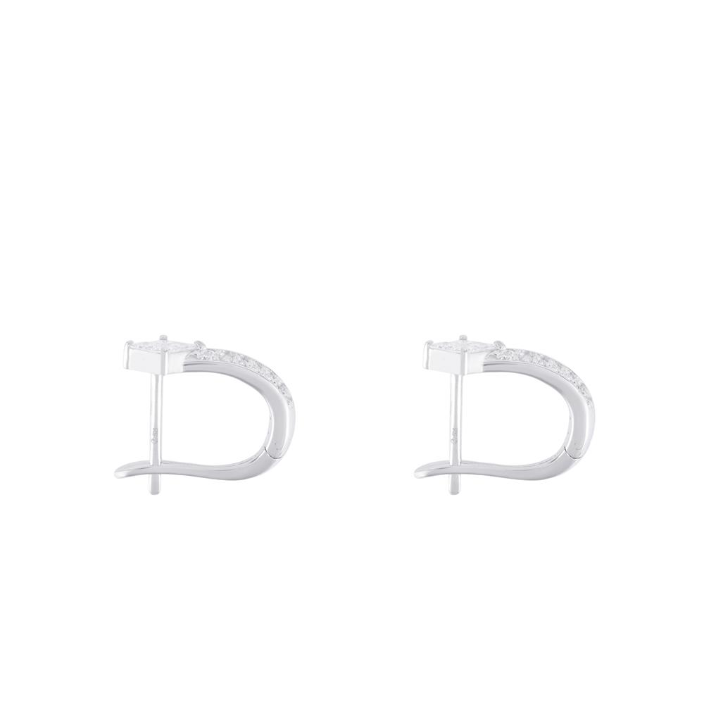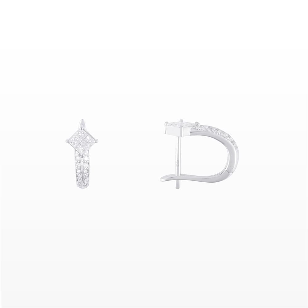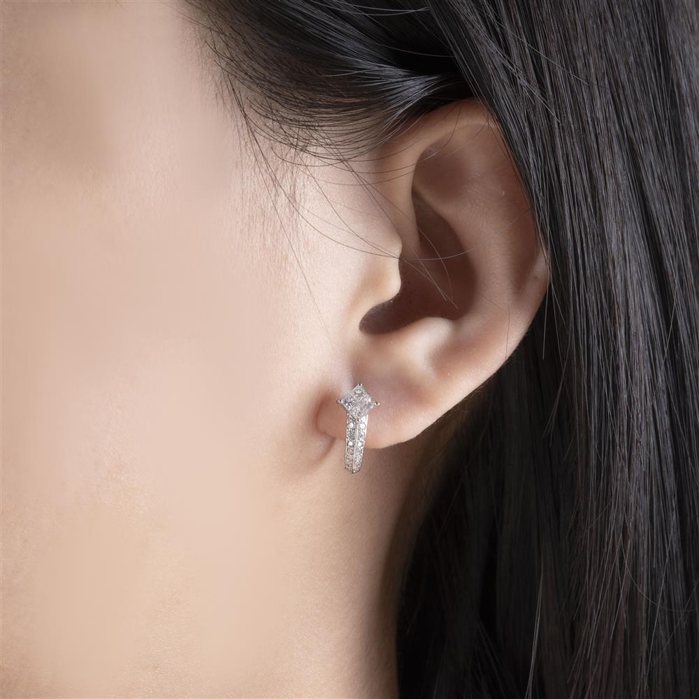 Đôi bông tai kim cương mang thiết kế dáng kẹp hiện đại, tạo hình hình học vuông vức ở phần đầu, kết hợp cùng dải kim cương nhỏ đính tinh xảo dọc thân, mang lại vẻ đẹp cá tính nhưng vẫn tinh tế. Kiểu dáng gọn gàng, đường nét sắc sảo giúp tổng thể trở nên nổi bật theo phong cách tối giản sang trọng.