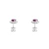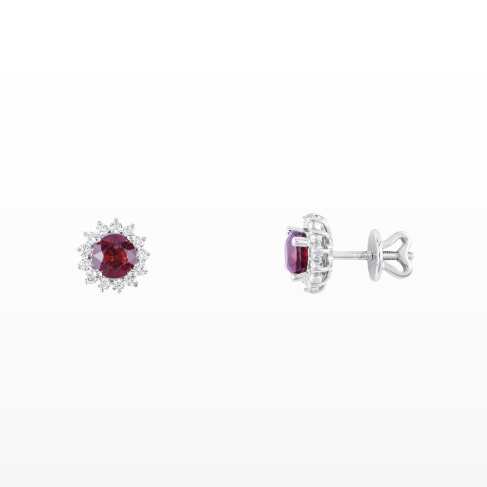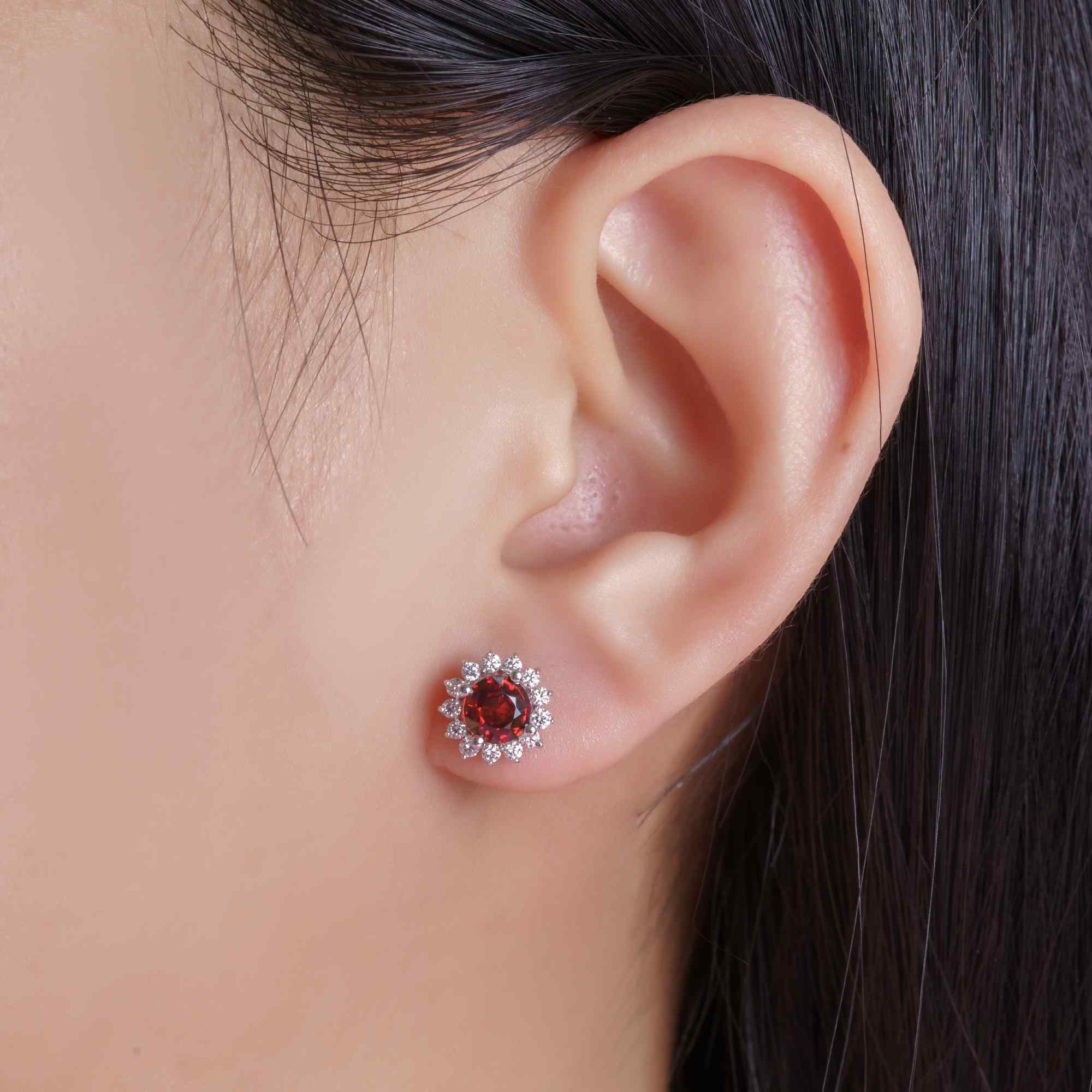 Đôi bông tai gây ấn tượng với viên Garnet đỏ rực ở vị trí trung tâm, được bao quanh bởi vòng kim cương nhỏ lấp lánh như một vầng hào quang tinh xảo. Sắc đỏ sâu đầy cuốn hút của ruby kết hợp cùng ánh trắng tinh khiết của kim cương tạo nên tổng thể sang trọng, nổi bật nhưng vẫn giữ được nét thanh lịch.