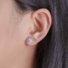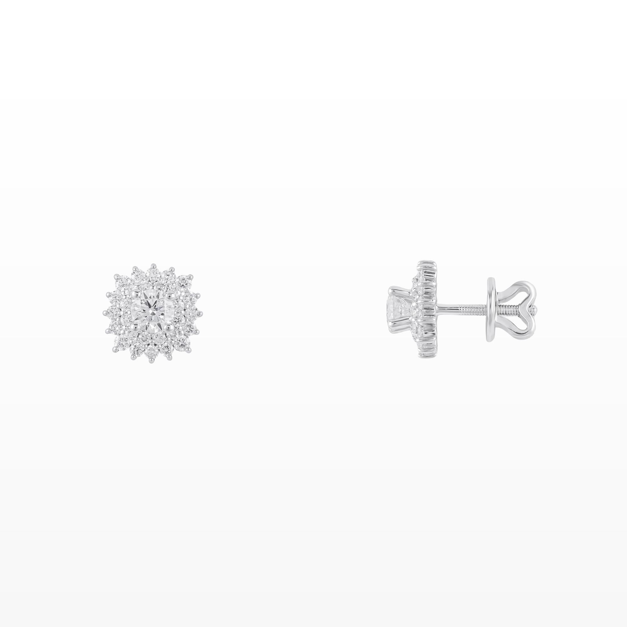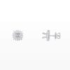 Đôi bông tai nổi bật với cụm kim cương tròn ở trung tâm, được bao quanh bởi vòng kim cương nhỏ sắp xếp đều đặn, tạo hiệu ứng halo lấp lánh như một đóa hoa ánh sáng. Thiết kế tinh xảo giúp tăng độ rực rỡ và chiều sâu, mang đến vẻ đẹp sang trọng nhưng vẫn giữ được nét nhẹ nhàng, thanh lịch.