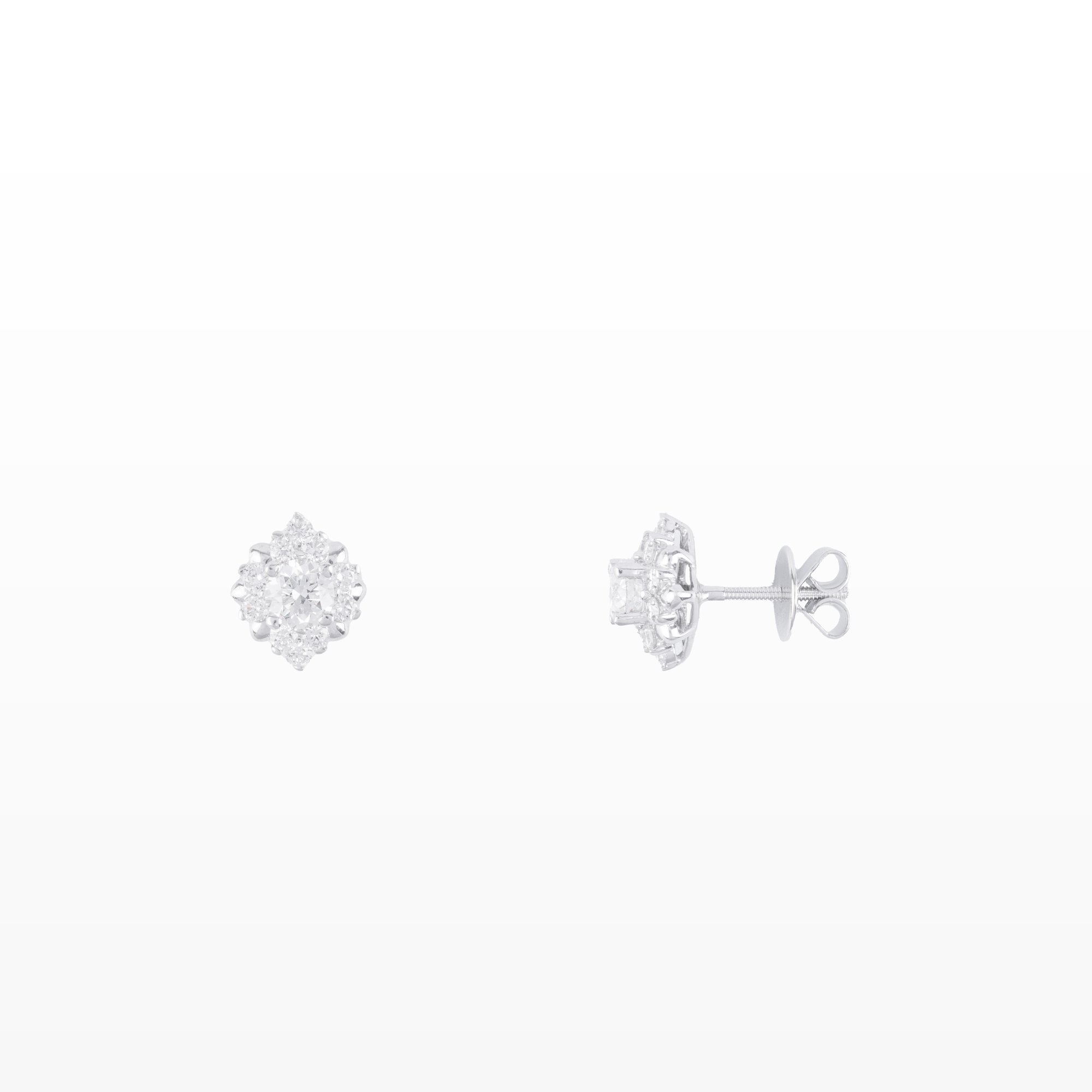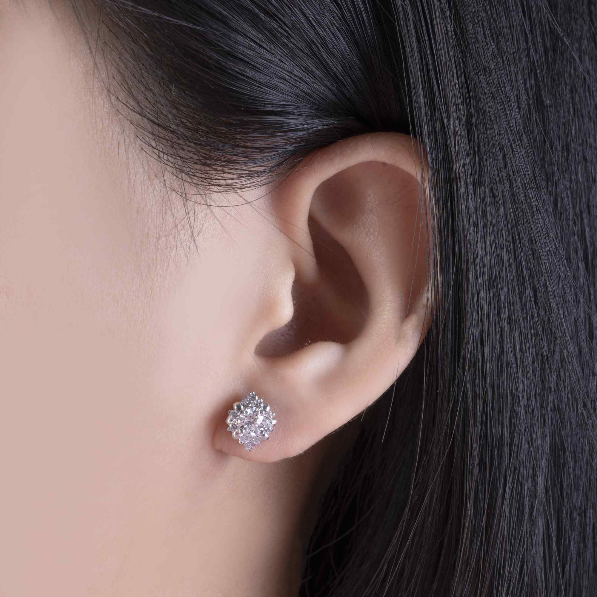 Đôi bông tai nổi bật với viên kim cương trung tâm được bao quanh bởi những viên tấm tinh xảo, tạo nên hiệu ứng ánh sáng bừng nở như một đóa hoa pha lê. Cấu trúc đính kết tỉ mỉ giúp tổng thể trở nên đầy đặn, lấp lánh hơn mà vẫn giữ được nét mềm mại, tinh tế.