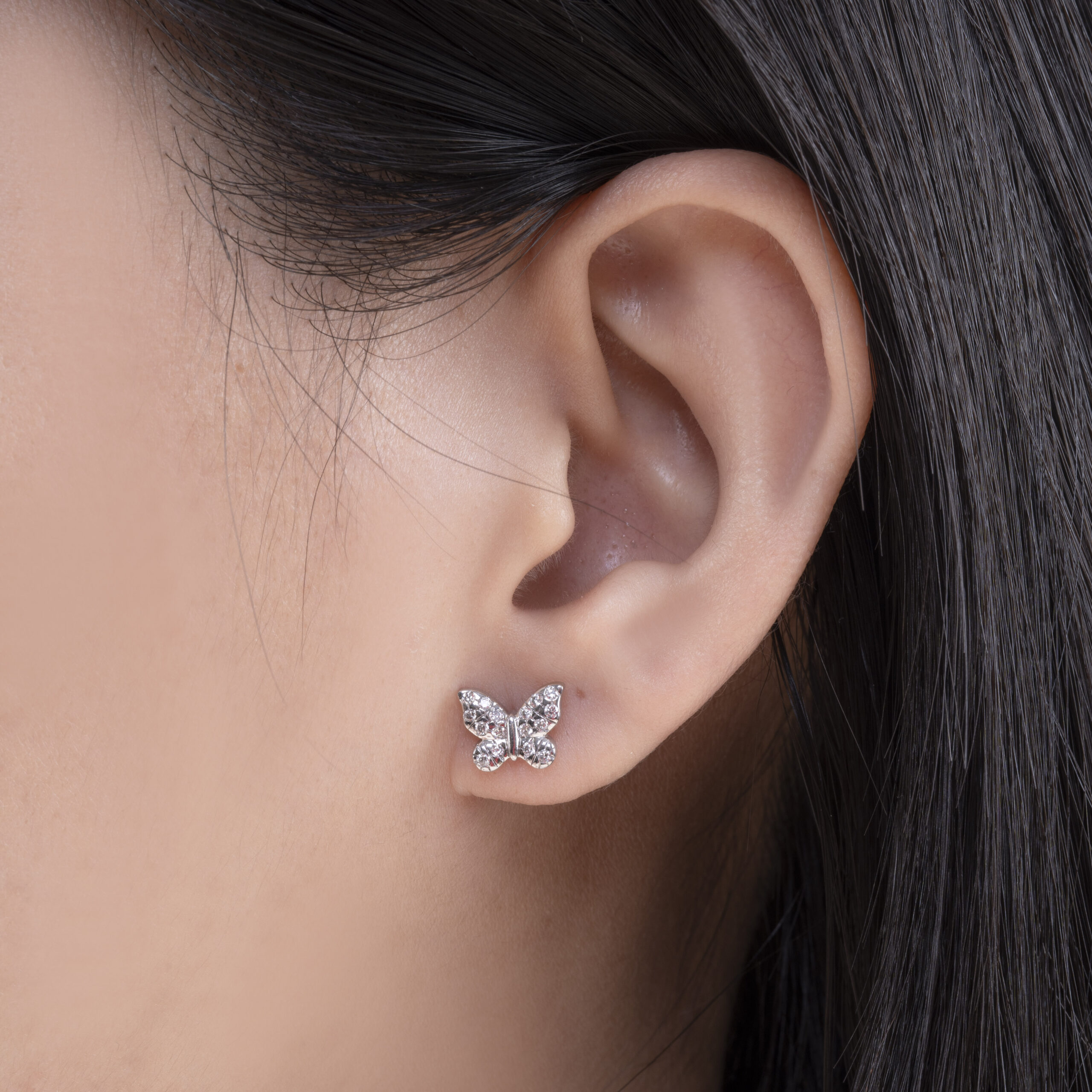 Thiết kế bông tai mô phỏng đôi cánh bướm đang bay lượn, đính kết những viên kim cương tự nhiên lấp lánh, tạo nên hiệu ứng ánh sáng rực rỡ ở mọi góc nhìn.