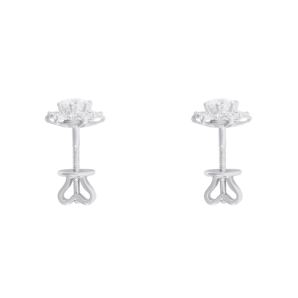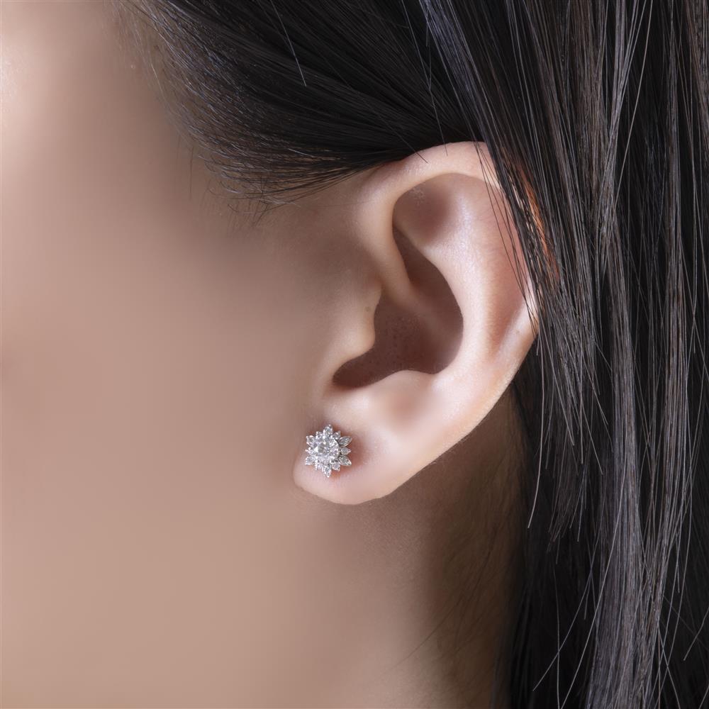 Tựa như một đóa hoa hé nở trong ánh sớm mai, đôi hoa tai mang vẻ đẹp tinh khôi và trong trẻo khiến ánh nhìn đầu tiên đã phải dừng lại. Mỗi cánh hoa được đính đá tỉ mỉ, lấp lánh như những tia nắng đang nhảy múa, bao quanh viên đá chủ rực sáng – điểm nhấn khiến gương mặt nàng như bừng lên sự rạng rỡ rất riêng.