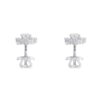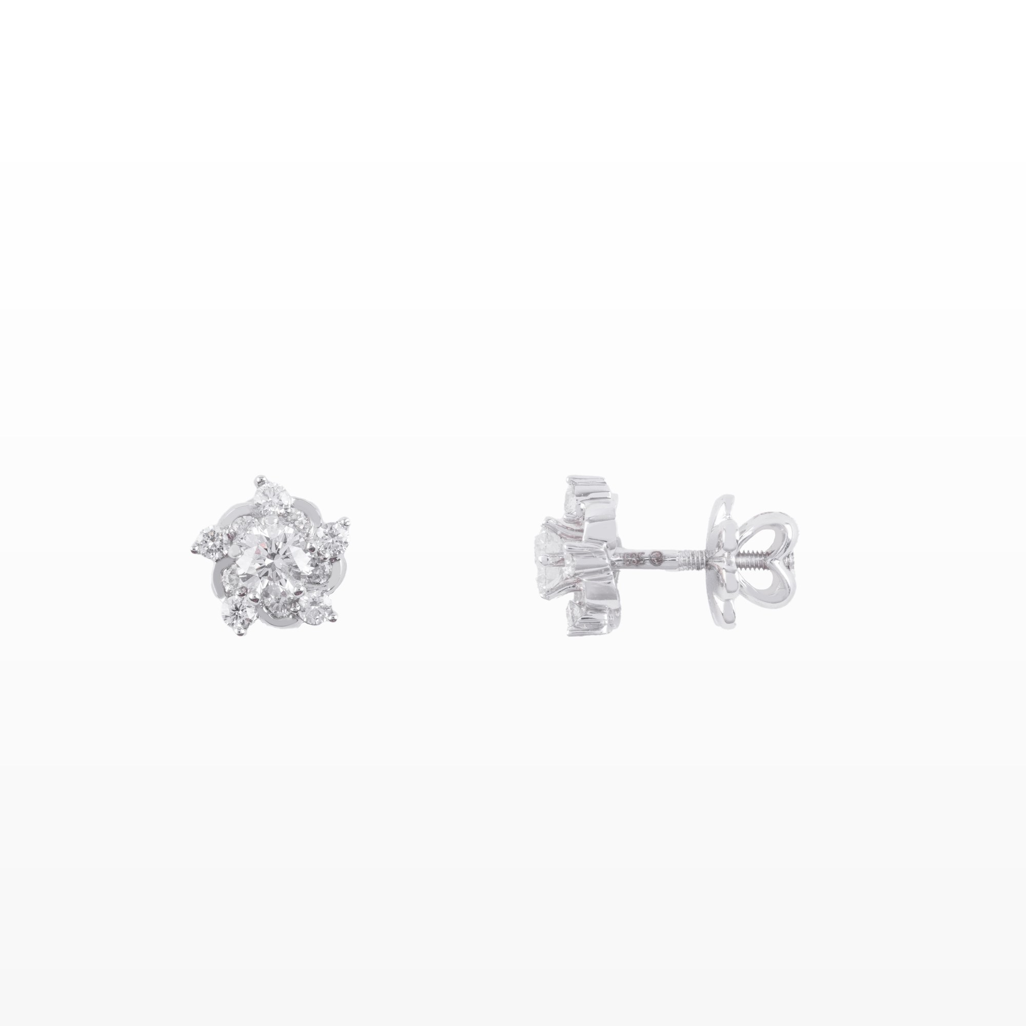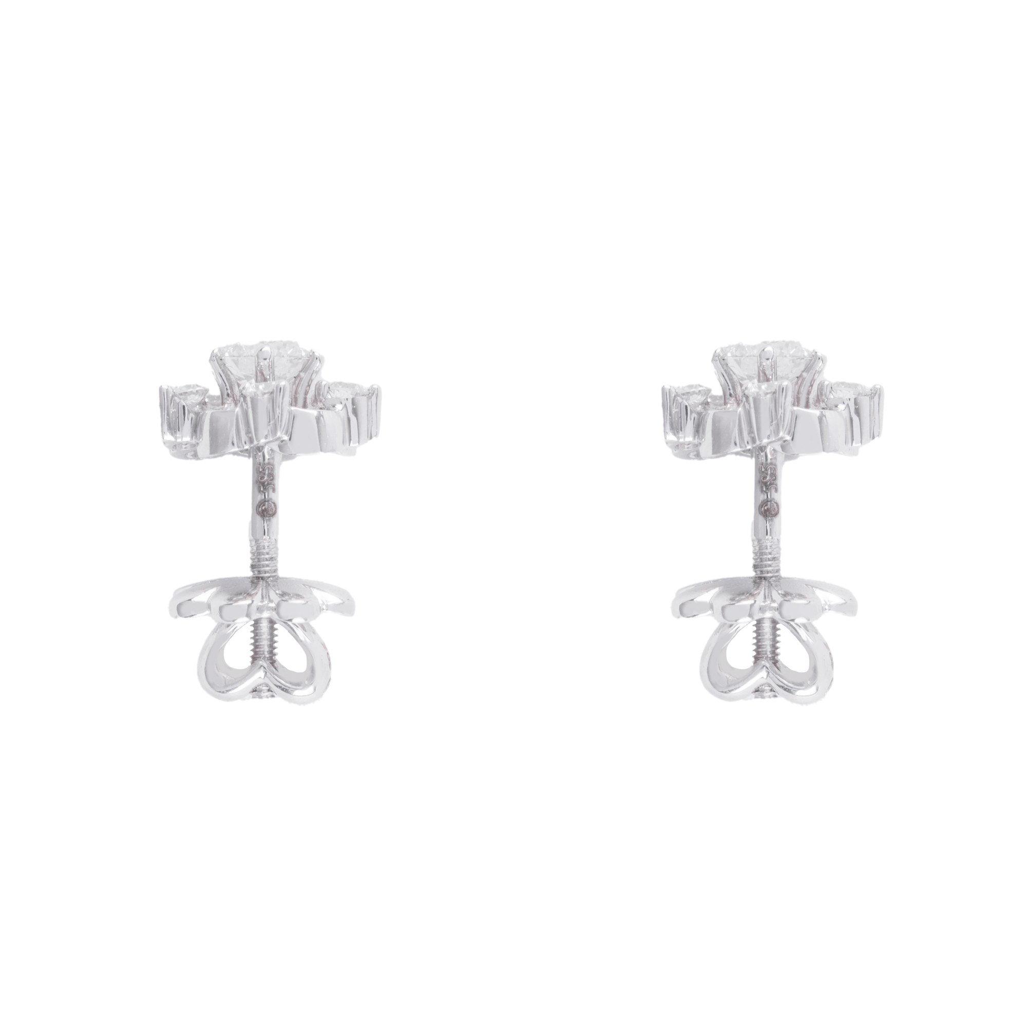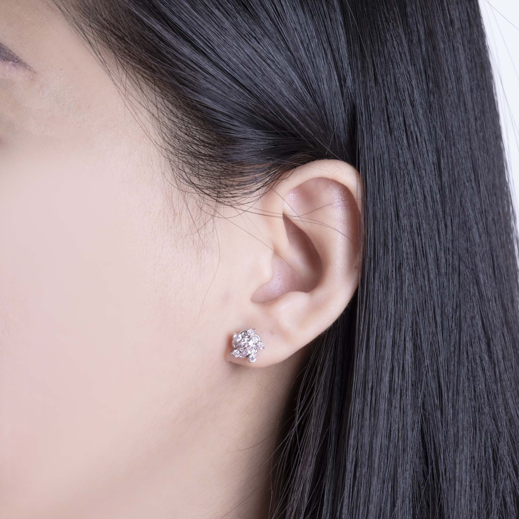 Đôi bông tai mang thiết kế hoa nở tinh xảo, nơi những viên kim cương được sắp xếp khéo léo tạo thành từng cánh hoa mềm mại, ôm trọn viên đá trung tâm rực rỡ. Hiệu ứng ánh sáng lan tỏa từ tâm ra ngoài mang đến vẻ lấp lánh sống động, như một đóa hoa đang khoe sắc dưới ánh nắng.