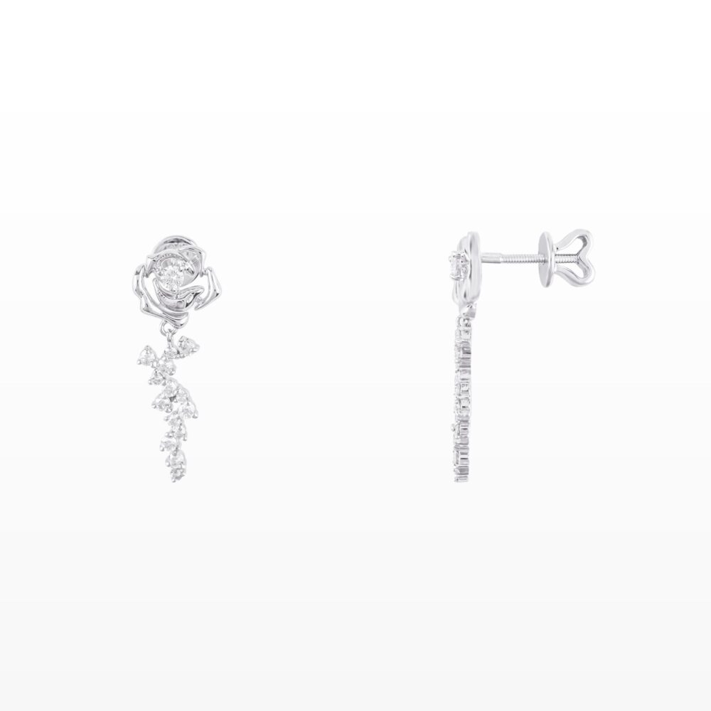 Bông tai vàng trắng thiết kế hoa hồng tinh tế với viên kim cương nhỏ ở trung tâm, kết hợp chuỗi kim cương rủ nhẹ phía dưới tạo chuyển động mềm mại khi đeo. Tổng thể thanh lịch, nữ tính và nổi bật, giúp gương mặt thêm rạng rỡ trong những dịp đặc biệt.