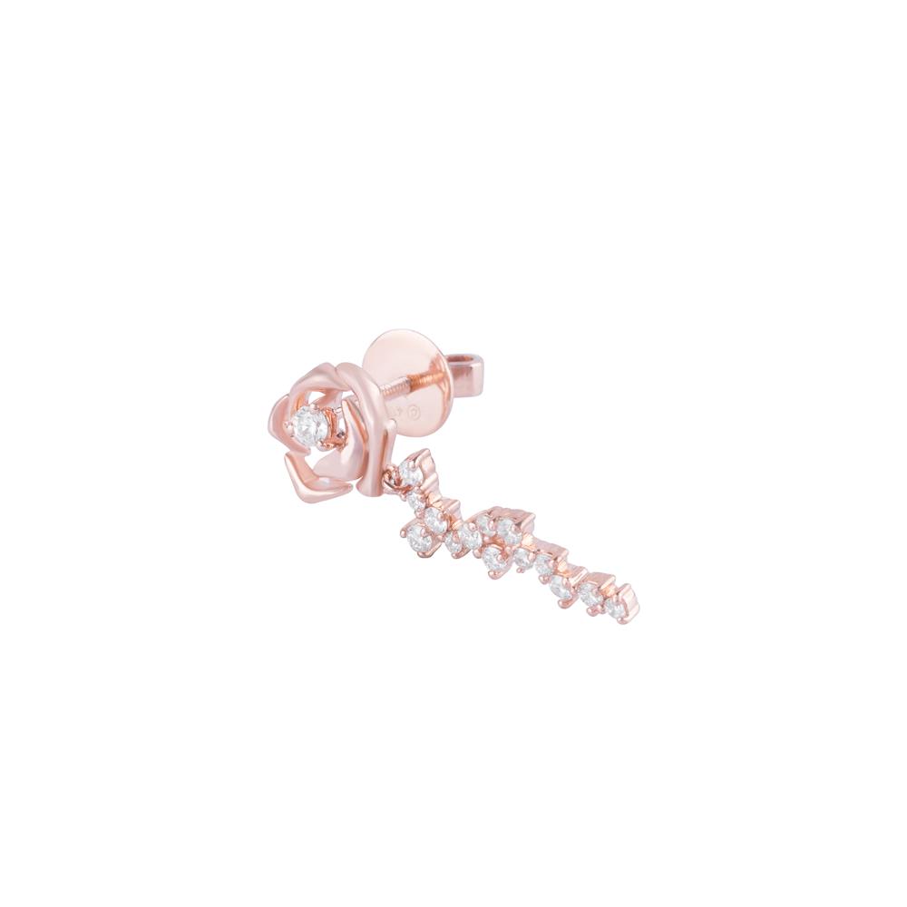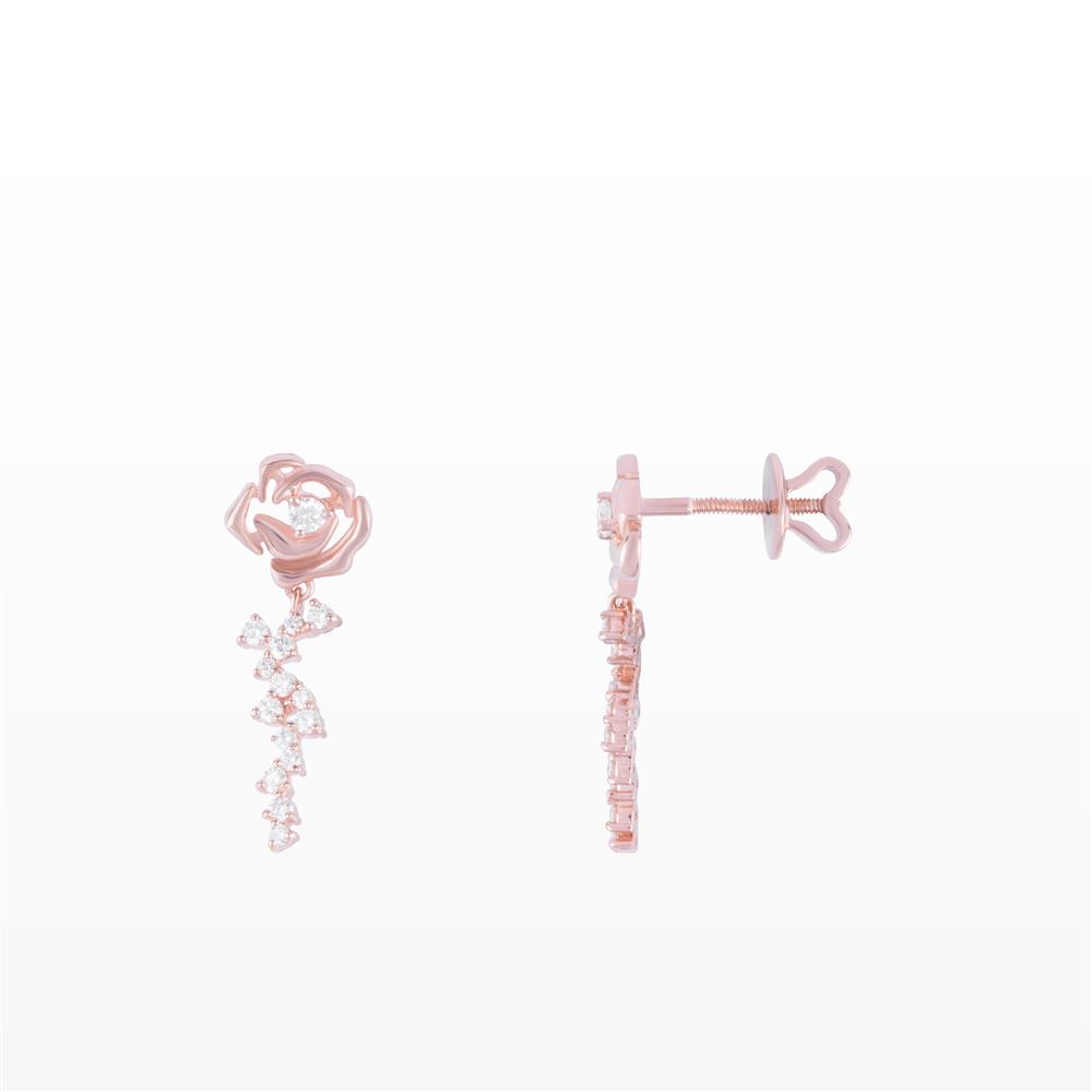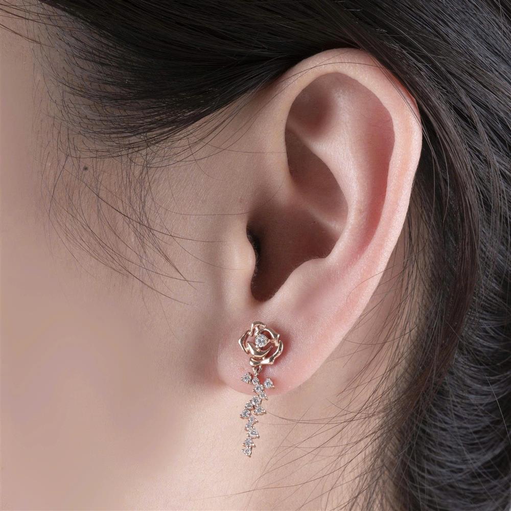Lấy cảm hứng từ vẻ đẹp kiêu sa của hoa hồng, đôi bông tai kim cương vàng hồng mang đến cảm giác nữ tính, tinh tế và đầy cuốn hút. Phần hoa hồng được tạo hình mềm mại, ôm trọn viên kim cương tròn trung tâm, tượng trưng cho vẻ đẹp rực rỡ và giá trị bền vững.