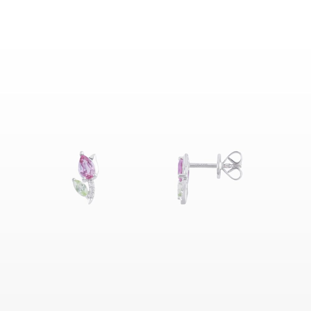 Thiết kế kết hợp các viên đá màu hồng, xanh và trắng được sắp xếp tinh tế như những chiếc lá nhỏ, tạo nên tổng thể mềm mại và cuốn hút.