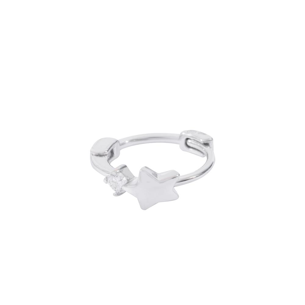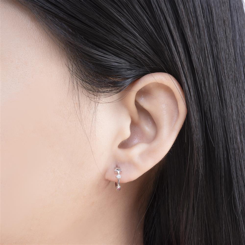 Thiết kế bông tai dạng khuyên tròn mini kết hợp charm ngôi sao treo mang đến vẻ đẹp trẻ trung, tinh nghịch nhưng vẫn giữ được nét thanh lịch. Điểm nhấn của mẫu là viên đá tấm sáng lấp lánh đặt ngay phía trước, giúp đôi tai nổi bật nhẹ nhàng mà không quá phô trương.