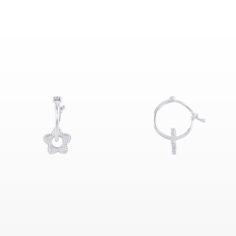 Thiết kế dáng thanh mảnh kết hợp charm hoa nhỏ viền kim cương lấp lánh, tạo nên điểm nhấn nhẹ nhàng nhưng cuốn hút. Dáng khuyên tròn gọn gàng giúp dễ đeo, phù hợp cho cả ngày thường lẫn những dịp đặc biệt.