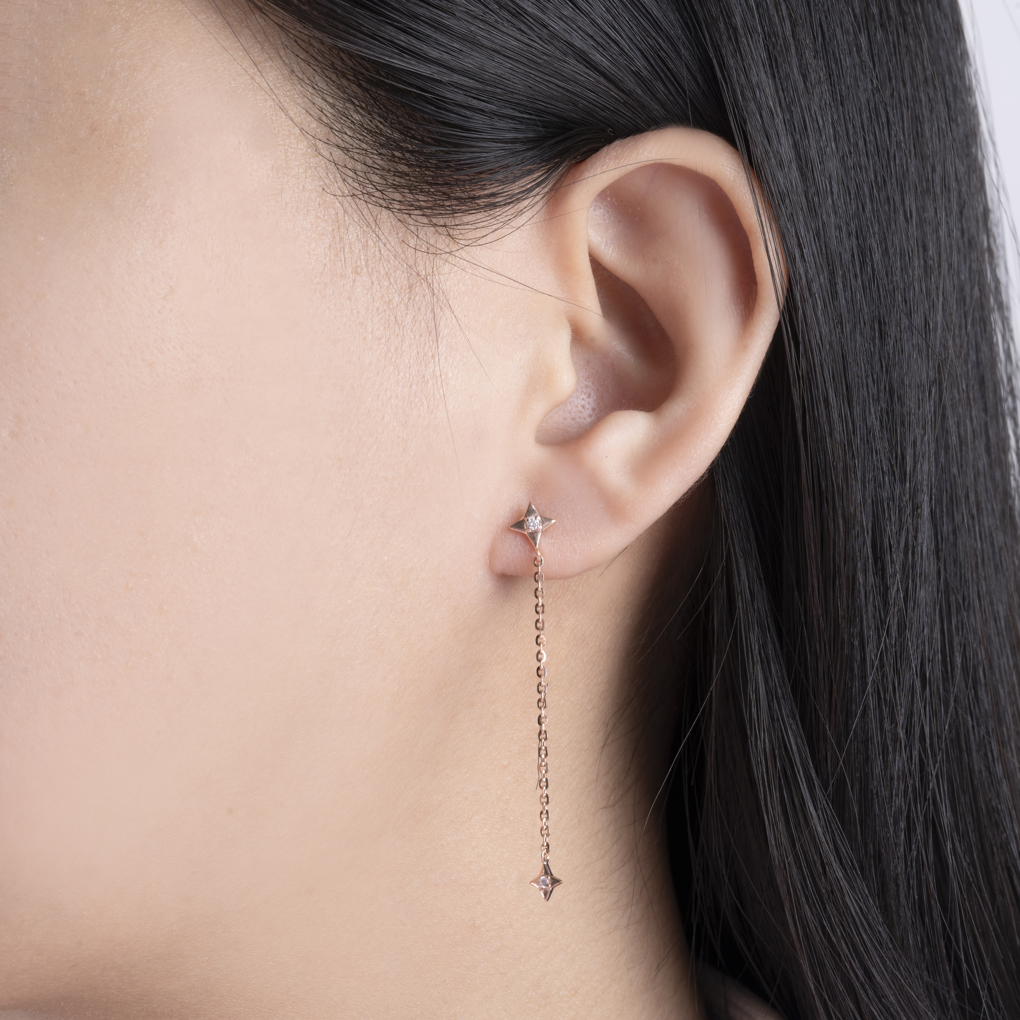 Đôi bông tai kim cương dáng thả ngôi sao mang vẻ đẹp thanh thoát và cuốn hút. Phần đầu bông tai được điểm xuyết viên kim cương nhỏ tinh tế, nối liền với sợi dây mảnh rủ nhẹ tạo hiệu ứng chuyển động mềm mại. Điểm nhấn ngôi sao ở cuối dây giúp tổng thể thêm lấp lánh và nổi bật. Thiết kế thanh lịch, hiện đại, lý tưởng để nàng tỏa sáng trong những khoảnh khắc đặc biệt