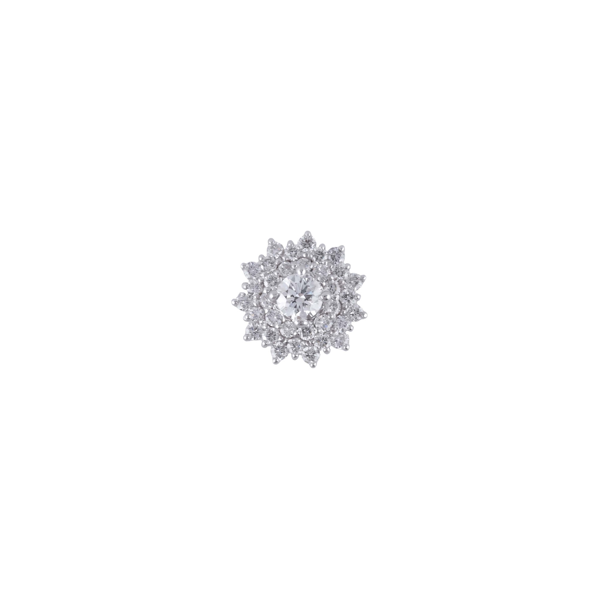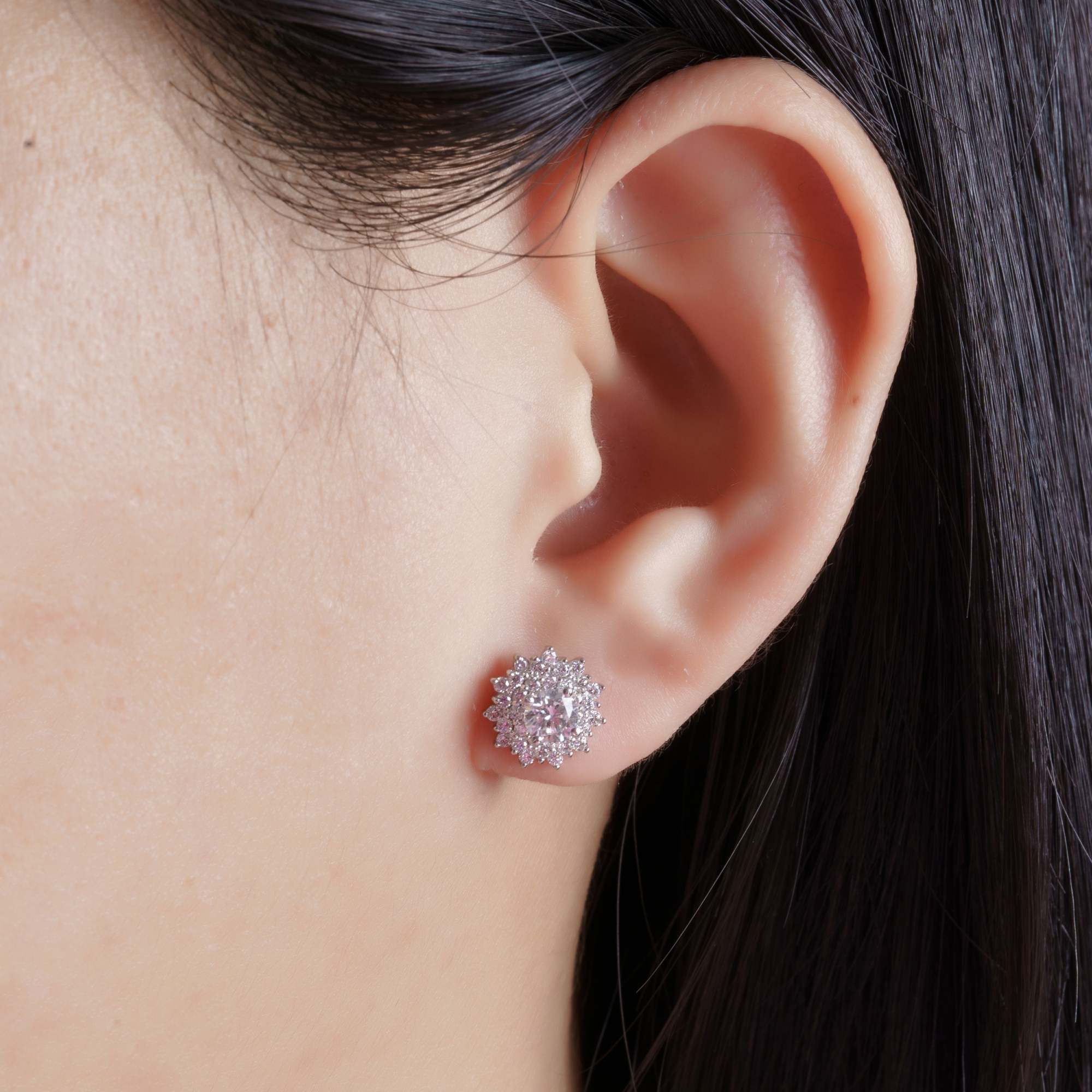 Lấy cảm hứng từ đóa hoa nở rộ trong khoảnh khắc rực rỡ nhất, thiết kế nổi bật với viên kim cương trung tâm làm tâm điểm, bao quanh bởi nhiều lớp kim cương nhỏ được sắp xếp tỉ mỉ. Cấu trúc nhiều tầng tạo chiều sâu thị giác, giúp tổng thể bông tai lấp lánh mạnh mẽ hơn, tựa như một “vầng hào quang” lan tỏa.