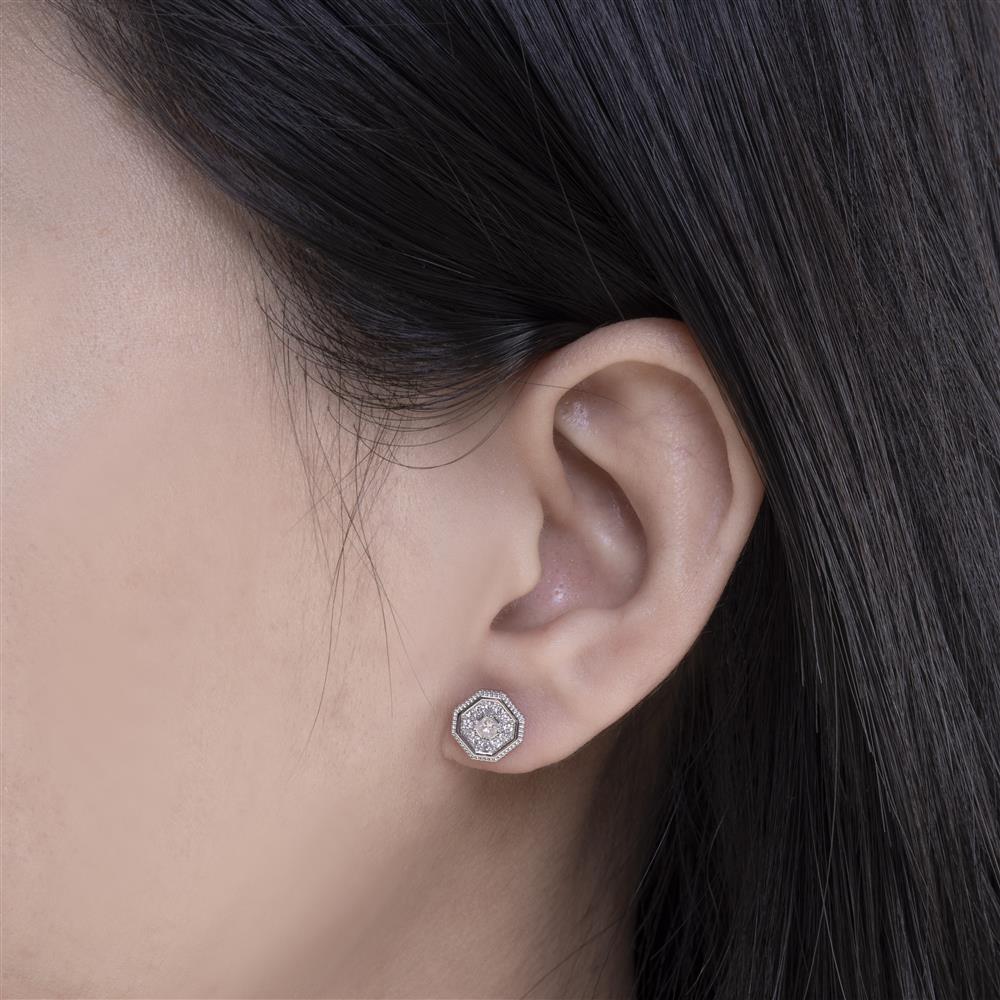 Đôi bông tai kim cương dáng lục giác, nổi bật với viên kim cương trung tâm tỏa sáng, được bao quanh bởi viền kim cương tấm nhỏ tinh xảo. Thiết kế hình khối hiện đại mang hơi hướng hoàng gia, giúp gương mặt bừng sáng ở mọi góc nhìn. Phù hợp cho những quý cô yêu phong cách thanh lịch và quyền quý.
