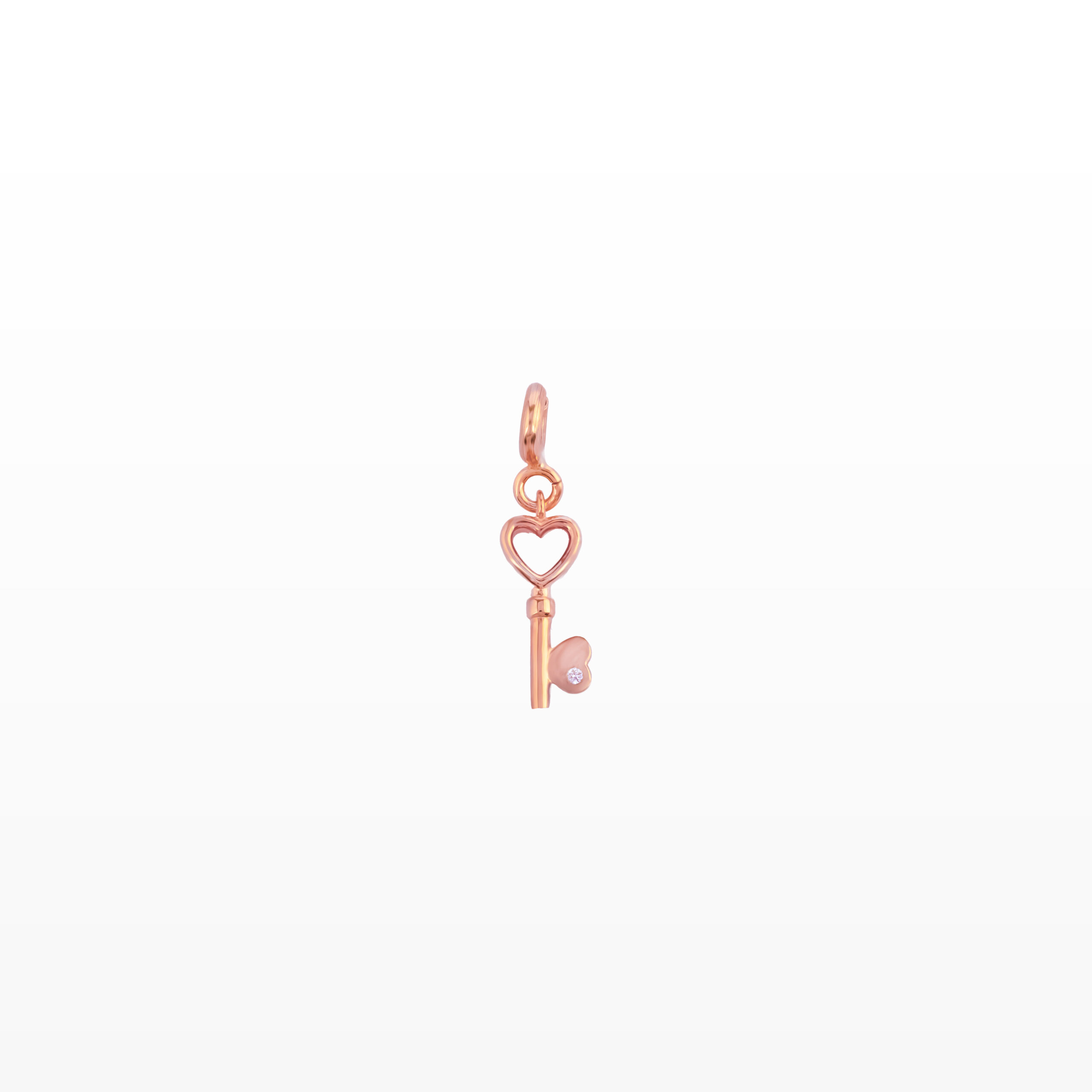Như một lời thì thầm ngọt ngào, charm chìa khóa trái tim được chế tác từ vàng hồng ấm áp, mang dáng hình tinh tế và đầy ý nghĩa. Phần đầu chìa khóa tạo hình trái tim rỗng mềm mại, biểu tượng cho tình yêu chân thành và sự kết nối sâu sắc. Thân chìa khóa thanh mảnh, kết thúc bằng chi tiết trái tim nhỏ đính kim cương, tỏa sáng dịu dàng như một bí mật được trân quý.