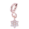 Charm hoa sáu cánh lấp lánh, được điểm xuyết bởi những viên đá nhỏ tinh khôi, như bông hoa tỏa sáng giữa nắng mai. Mỗi cánh hoa mang đến cảm giác nhẹ nhàng, thuần khiết, đồng thời là biểu tượng của sự may mắn và tình yêu ngọt ngào