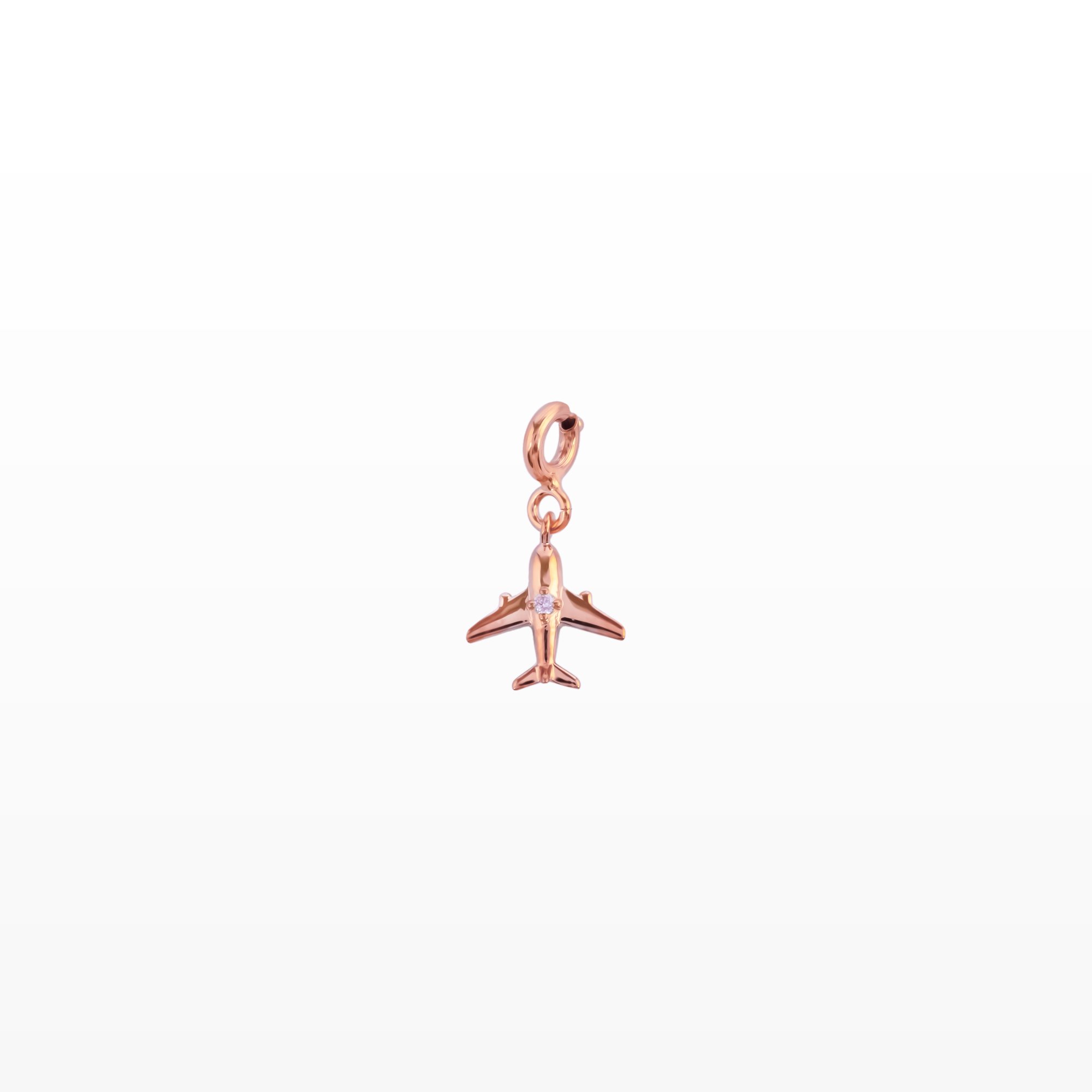 Thiết kế máy bay nhỏ nhắn được chế tác tinh xảo từ vàng hồng, bề mặt bóng mịn, từng đường nét gọn gàng như đang sải cánh giữa bầu trời. Điểm nhấn là viên kim cương lấp lánh đặt khéo léo ở thân máy bay, tượng trưng cho ánh sáng dẫn lối – niềm tin vào hành trình phía trước.