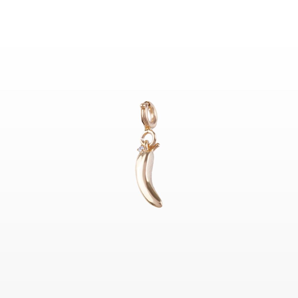 Charm quả chuối gây ấn tượng với thiết kế cong mềm tự nhiên, tái hiện hình ảnh trái chuối chín duyên dáng – biểu tượng của sự ấm no, may mắn và năng lượng tích cực. Bề mặt được đánh bóng mịn màng, phản chiếu ánh sáng tinh tế, tạo cảm giác sang trọng nhưng vẫn gần gũi.