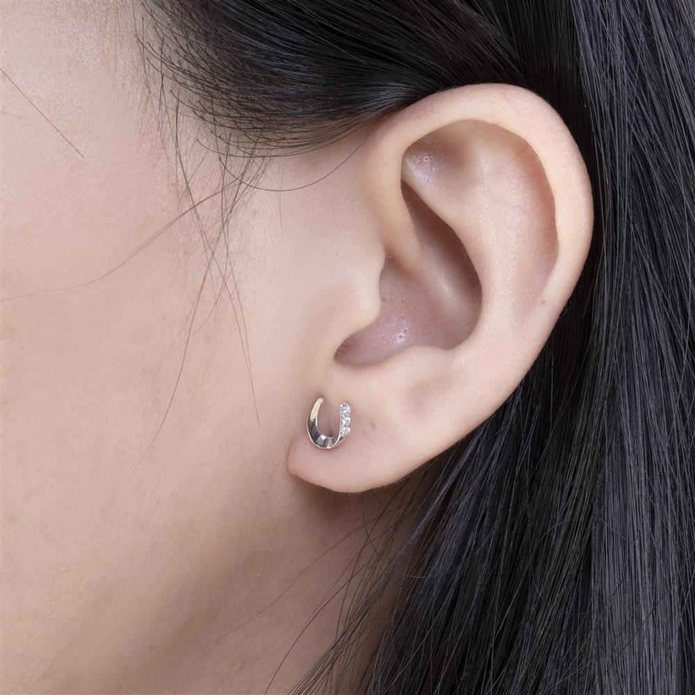 Đôi bông tai chữ U đính kim cương mang thiết kế độc đáo, hiện đại và đầy tinh tế. Đường cong mềm mại hình chữ U ôm nhẹ dái tai, được điểm xuyết bằng những viên kim cương tấm lấp lánh, tượng trưng cho sự may mắn và viên mãn. Phù hợp với phong cách thanh lịch, tinh giản nhưng vẫn đầy cuốn hút.