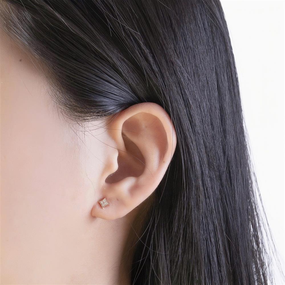 Thiết kế bông tai nụ hình vuông cách điệu mang vẻ đẹp hiện đại nhưng vẫn mềm mại nhờ những đường bo cong tinh tế. Ở trung tâm, nhóm kim cương thiên nhiên được xếp thành bố cục cân đối, tạo điểm sáng lấp lánh như một vì tinh tú thu nhỏ.