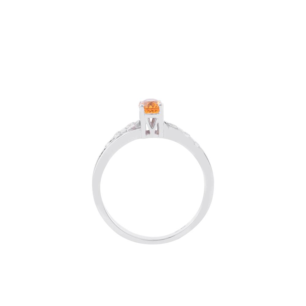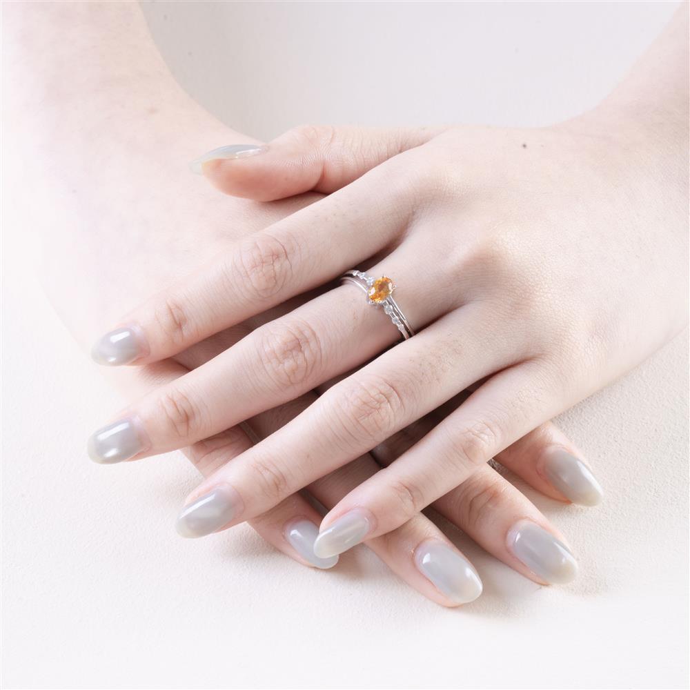 Chiếc nhẫn nổi bật với viên Citrine oval rực rỡ, sắc cam vàng như giọt nắng đọng lại nơi đầu ngón tay. Ánh sáng từ Citrine tỏa ra sự ấm áp, lạc quan và nguồn năng lượng tích cực – đúng tinh thần của viên đá được mệnh danh là “đá thịnh vượng”.