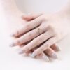 Thiết kế thân nhẫn gồm hai dải mềm mại giao nhau, tạo hiệu ứng uyển chuyển như dòng ánh sáng đang ôm trọn lấy viên đá chủ. Hai bên còn được điểm xuyết những viên đá trắng nhỏ, lấp lánh nhẹ nhàng, giúp tổng thể trở nên tinh tế và sang trọng hơn.