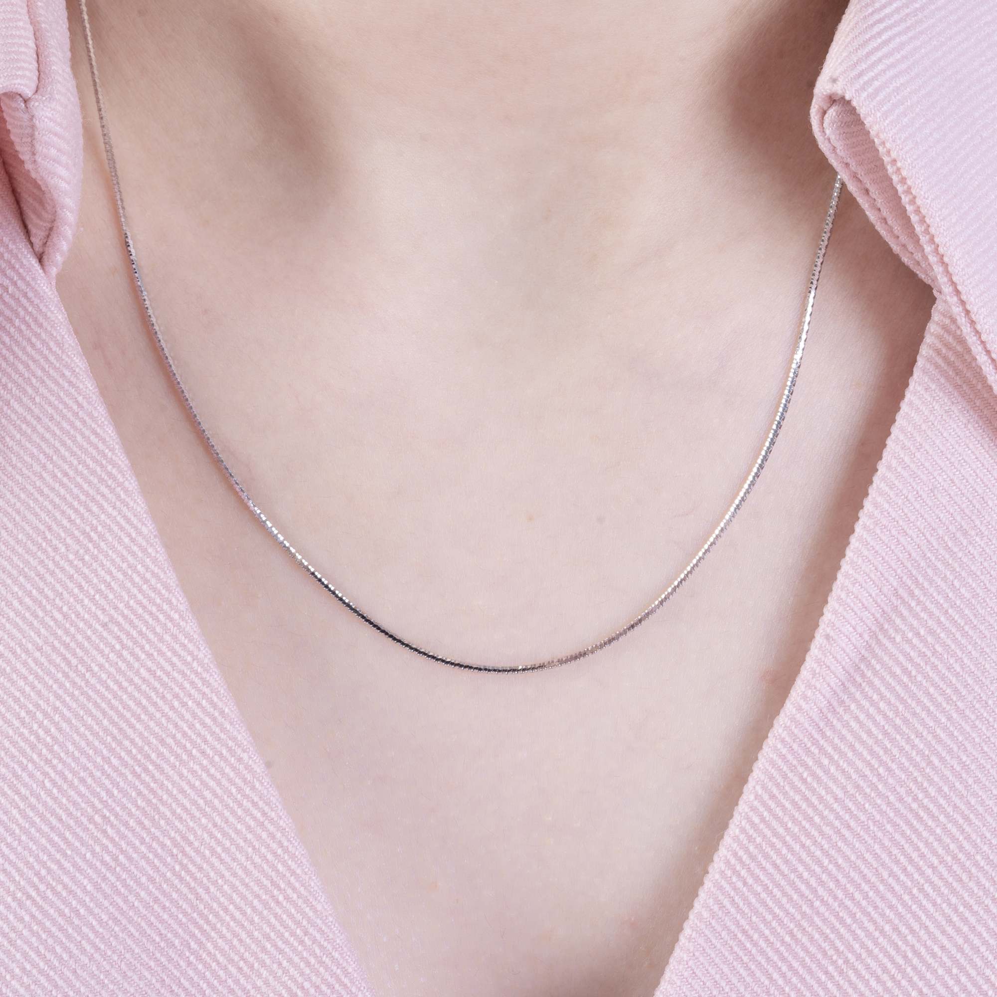 Chiếc dây chuyền mang thiết kế tối giản với sợi dây thanh mảnh, tinh tế, tôn lên vẻ đẹp nhẹ nhàng và thuần khiết của người đeo. Bề mặt dây được hoàn thiện tỉ mỉ, tạo độ bắt sáng nhẹ, mang lại hiệu ứng lấp lánh tinh tế trong từng chuyển động.