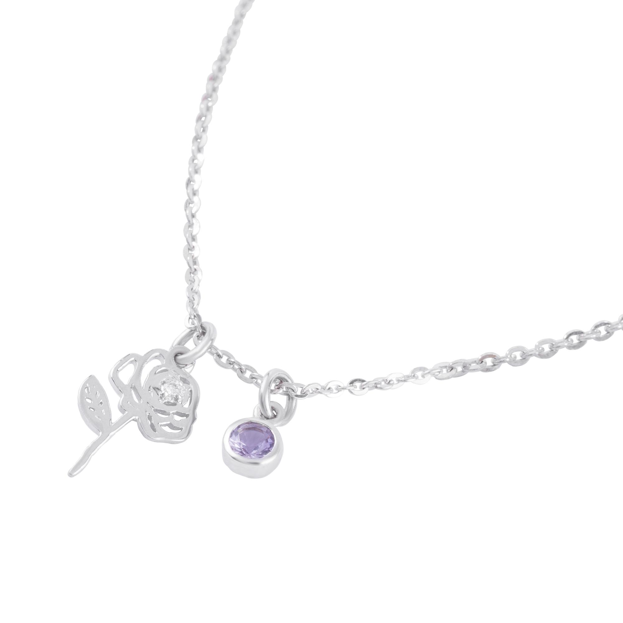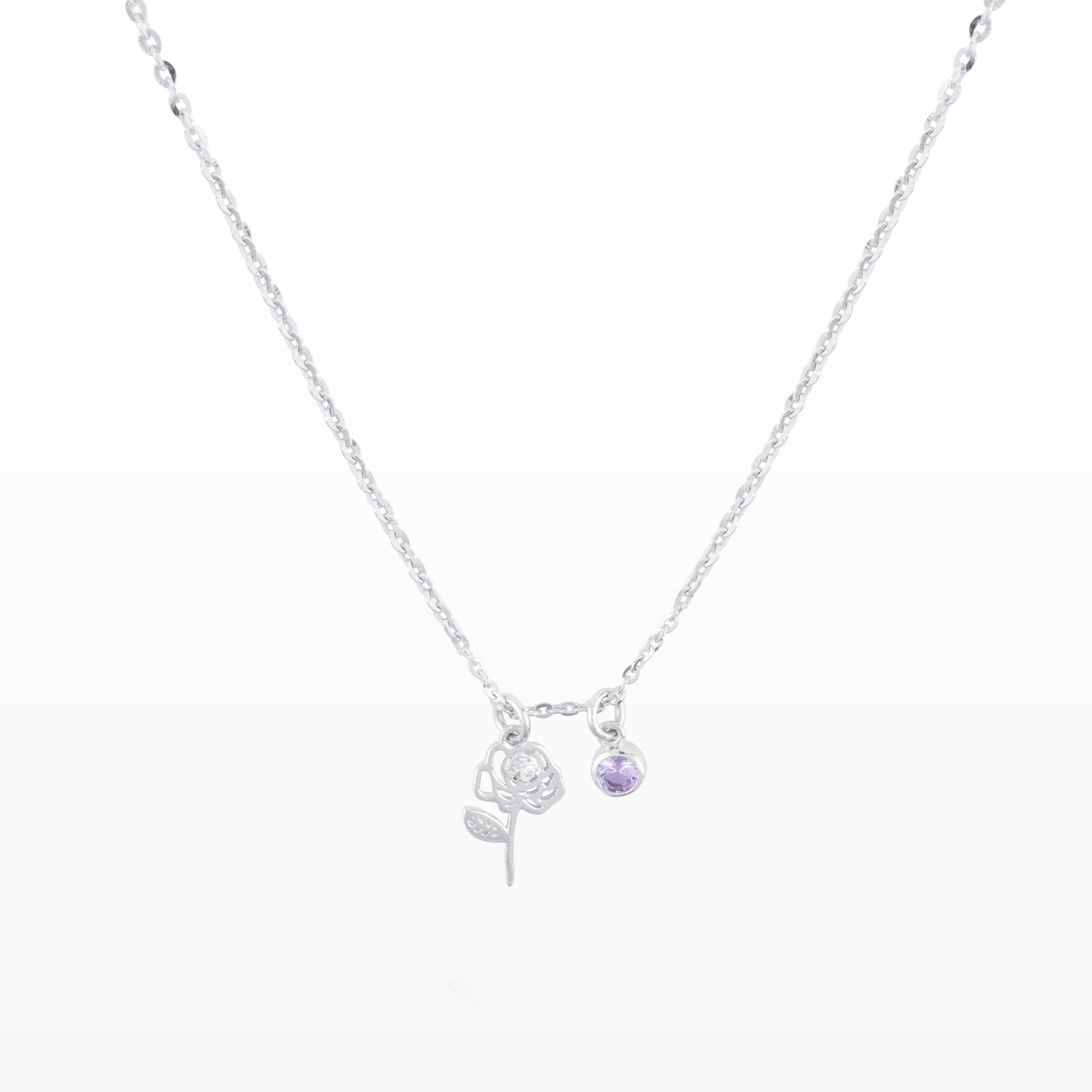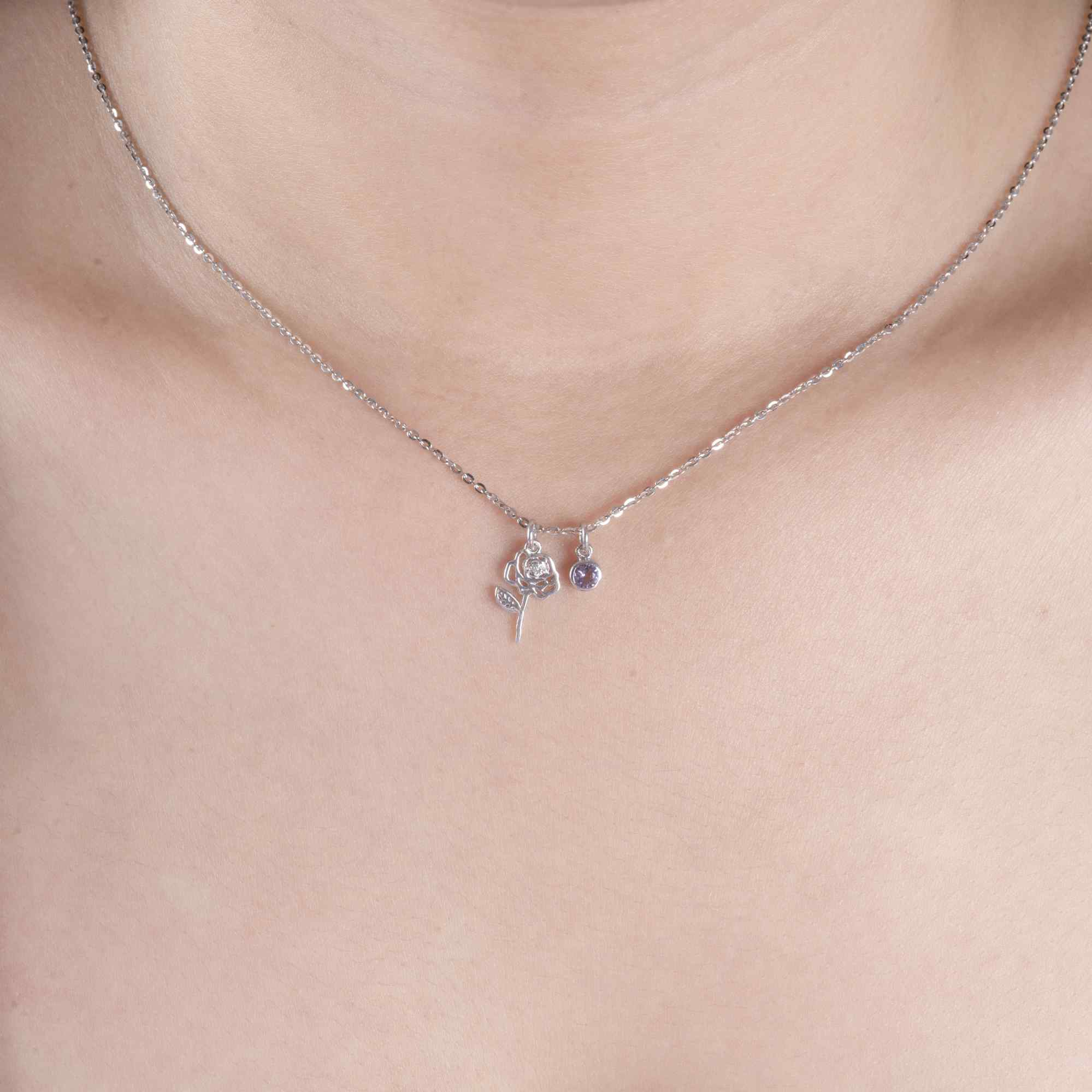 Chiếc dây chuyền mang vẻ đẹp mong manh và tinh tế, với charm hoa nhỏ xinh rủ nhẹ bên cổ, đi cùng viên đá Amethyst tròn điểm xuyết như một nốt nhạc lấp lánh. Thiết kế tối giản nhưng đầy cảm xúc, gợi lên sự dịu dàng, trong trẻo và nữ tính.