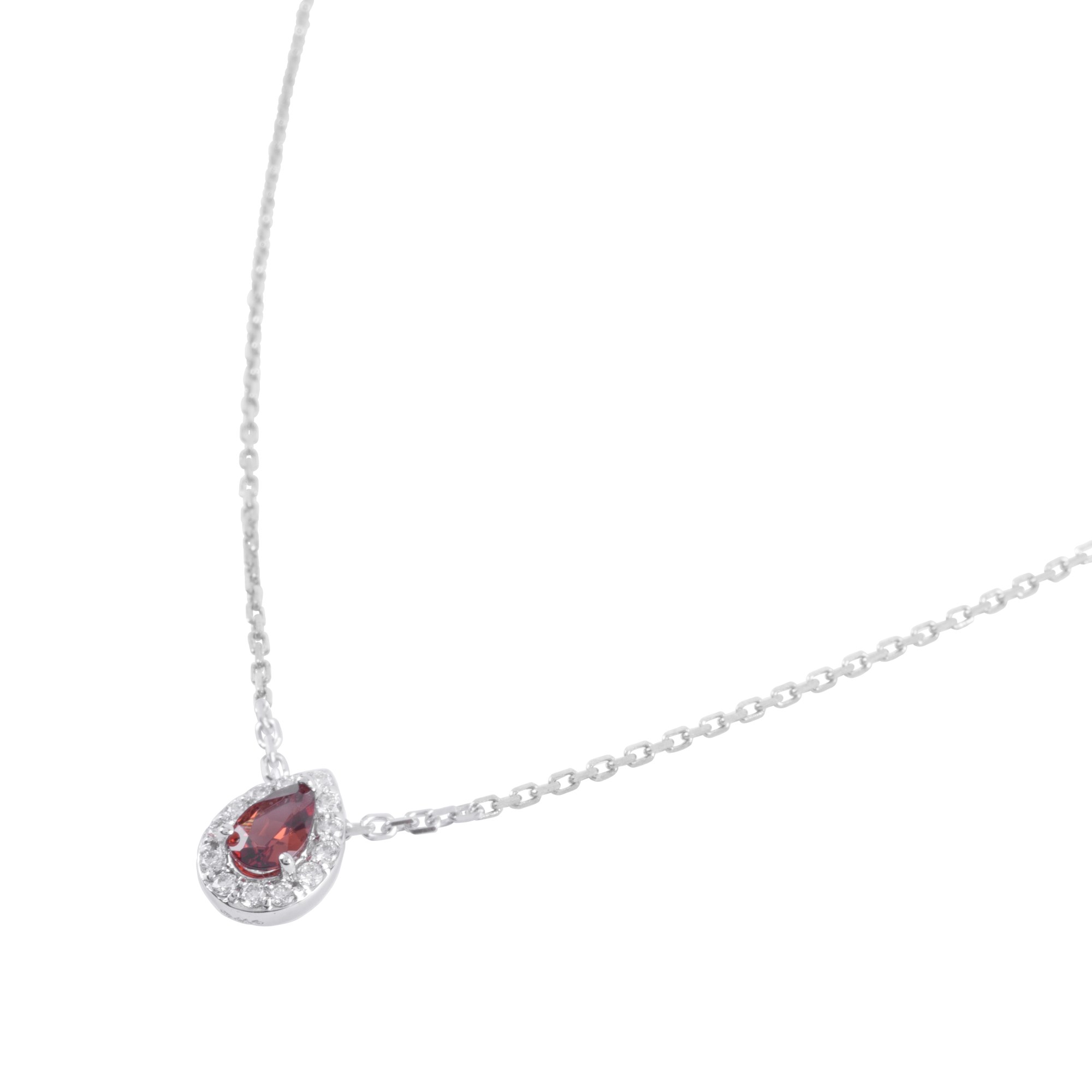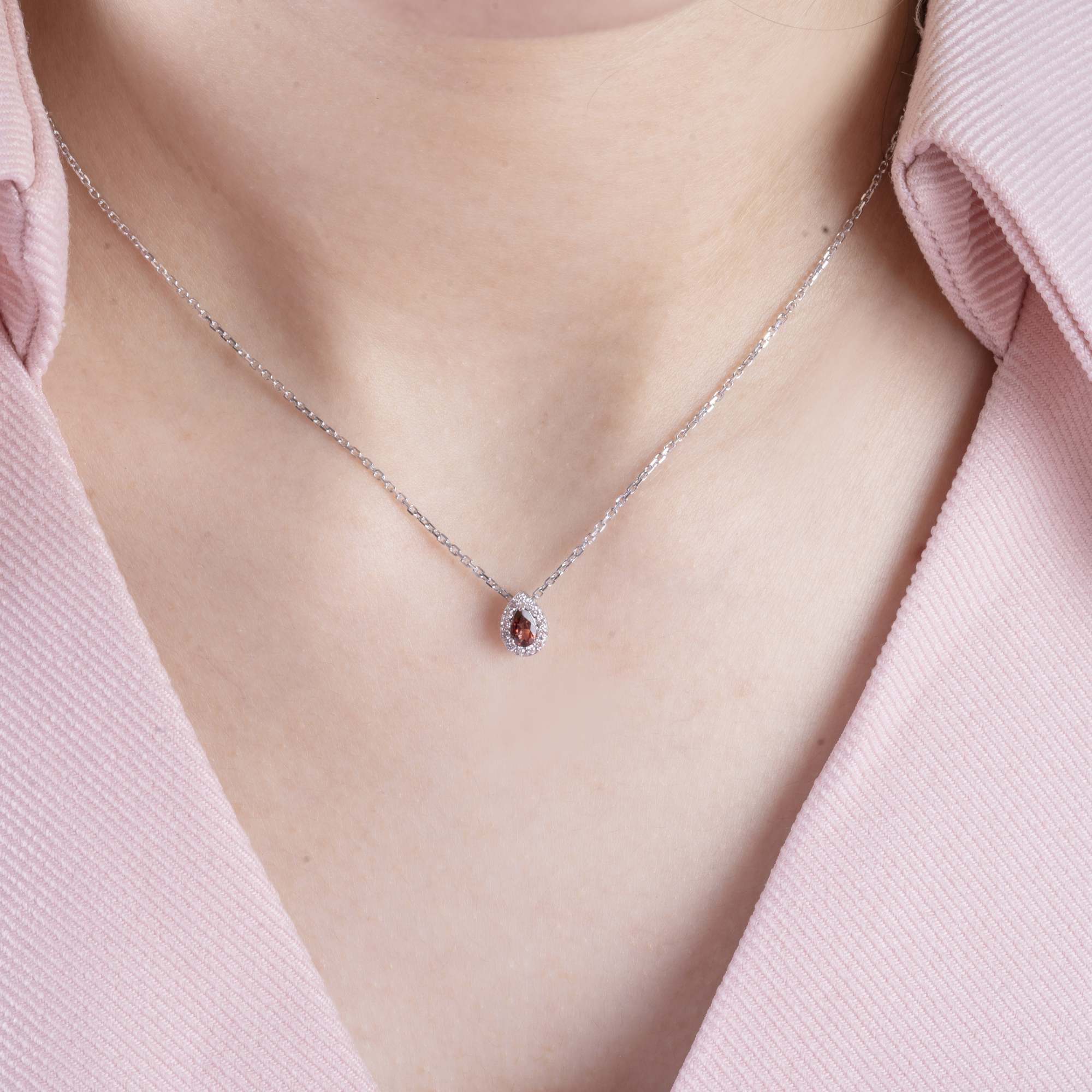 Chiếc dây chuyền mang vẻ đẹp tinh tế và đầy cuốn hút, nổi bật với mặt đá dáng giọt nước (pear) – biểu tượng của sự thanh khiết và cảm xúc sâu lắng. Viên đá trung tâm sắc nâu ấm áp, tựa như ánh hoàng hôn dịu nhẹ, tạo nên điểm nhấn khác biệt và sang trọng.