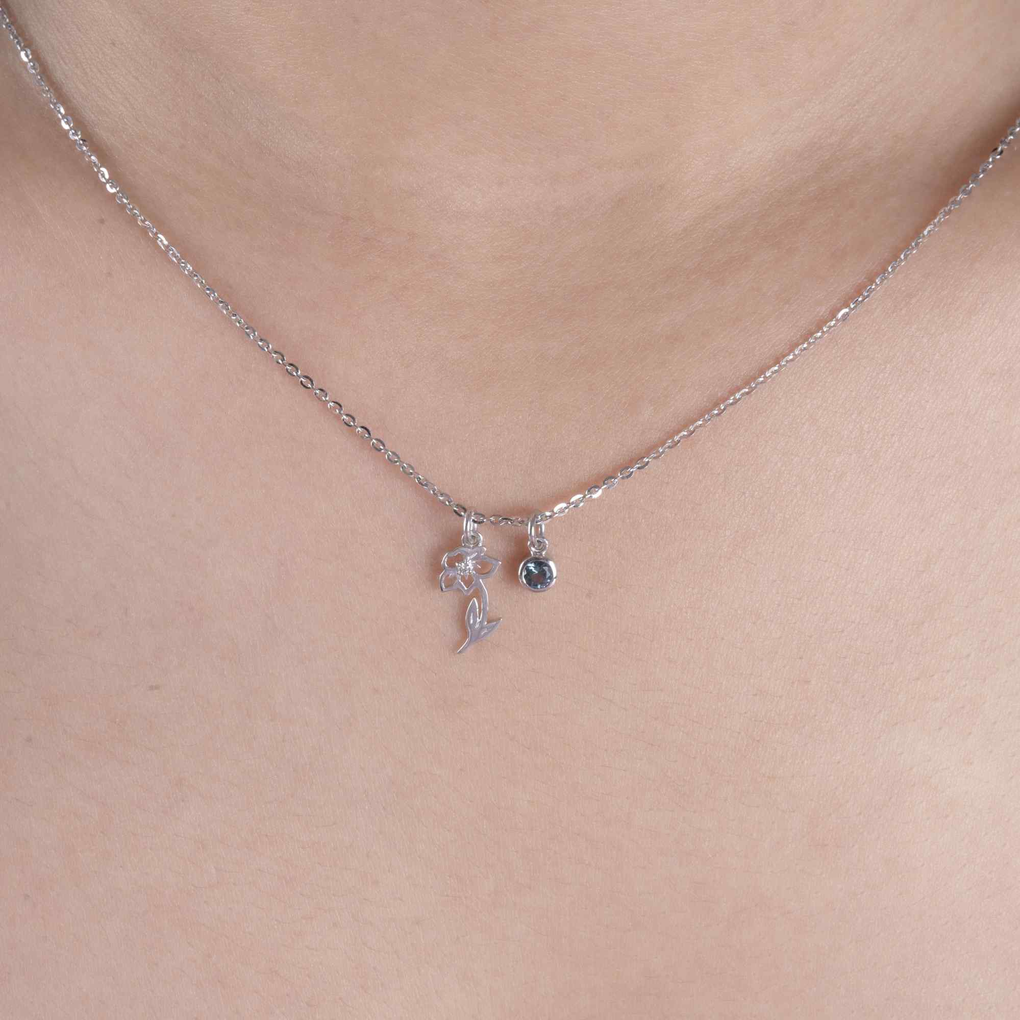 Chiếc dây chuyền mang vẻ đẹp mong manh và tinh tế, với charm hoa nhỏ xinh rủ nhẹ bên cổ, đi cùng viên Topaz london tròn điểm xuyết như một nốt nhạc lấp lánh. Thiết kế tối giản nhưng đầy cảm xúc, gợi lên sự dịu dàng, trong trẻo và nữ tính.