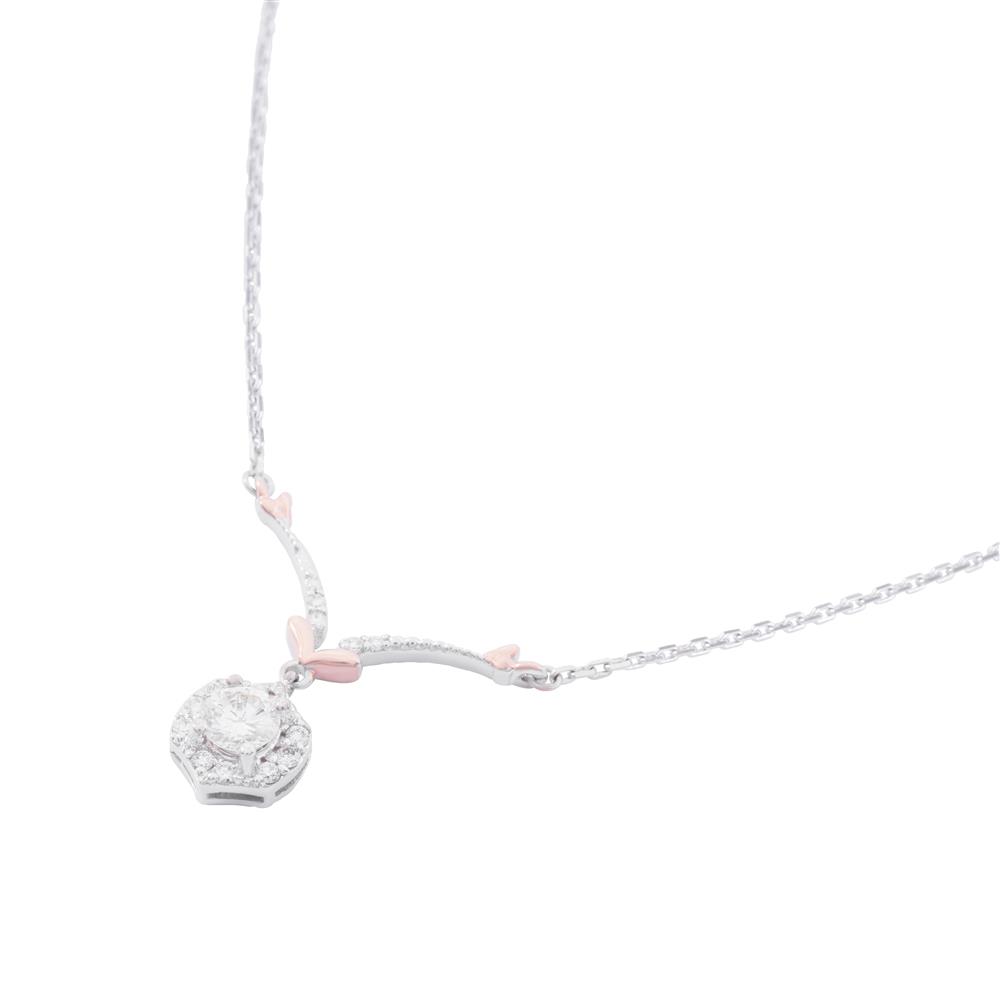 Điểm nhấn vàng hồng được đặt khéo léo giữa hai nhánh, tạo cảm giác ấm áp và dịu dàng, làm nổi bật mặt dây kim cương phía dưới. Mặt dây được chế tác dạng hoa 6 cánh, tâm đá lớn bao quanh bởi các viên tấm li ti, tạo nên hiệu ứng “nở sáng” rực rỡ ở từng góc nhìn.