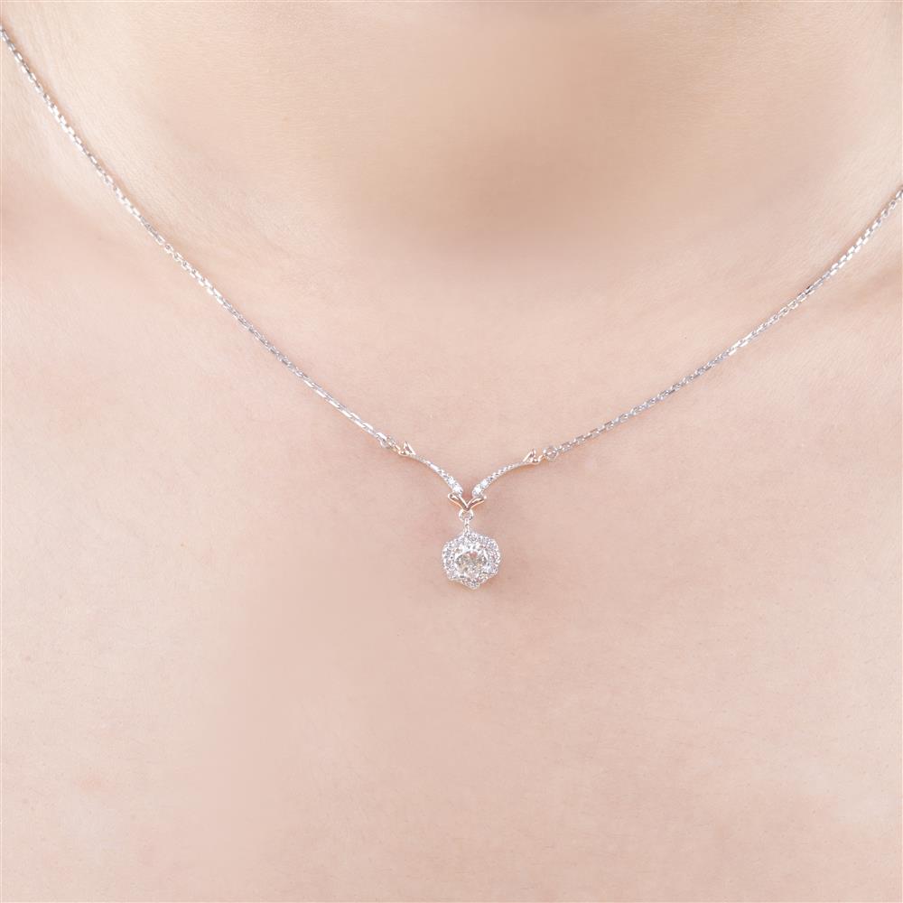 Thanh thoát, tinh tế và đầy nữ tính — mẫu dây chuyền kim cương này tựa như một nhành hoa đang khẽ nghiêng mình trên làn gió nhẹ. Thiết kế dạng chữ V mềm ôm trọn đường cổ, giúp tôn bờ vai và mang đến vẻ thanh lịch tự nhiên cho nàng.