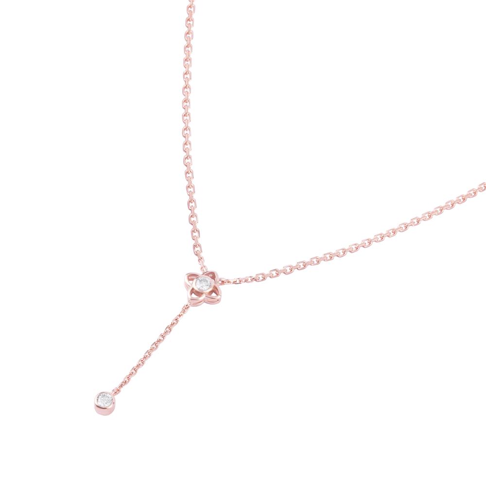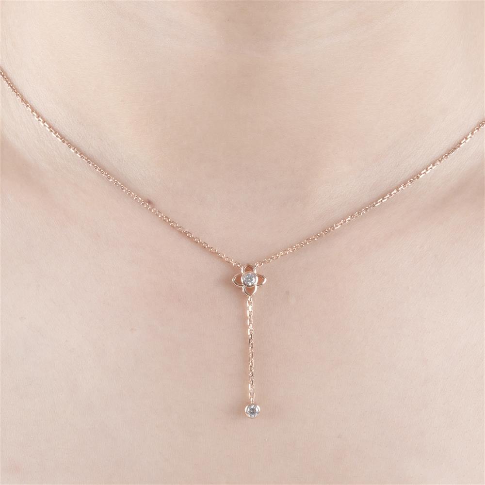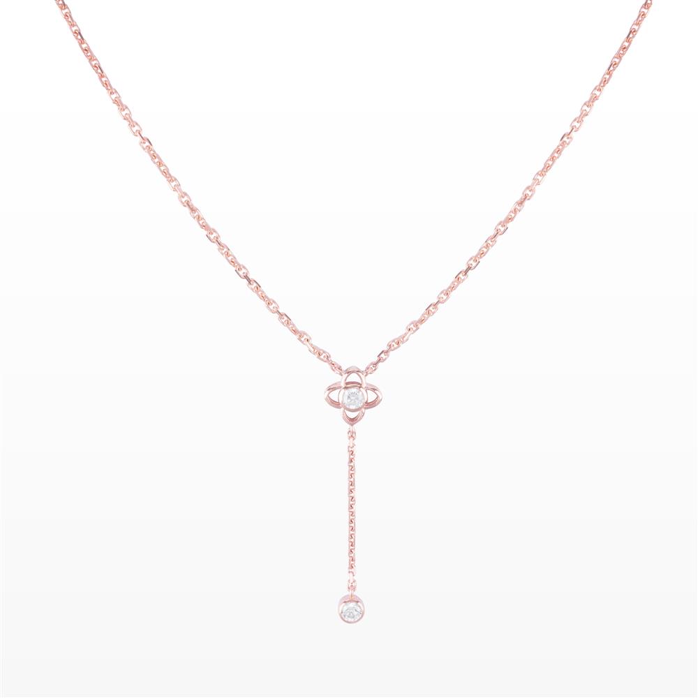 Thiết kế dây chuyền nổi bật với họa tiết hoa bốn cánh cách điệu ở trung tâm, các đường cong đan xen mềm mại như một điểm chạm nhẹ nhàng của cảm xúc . Tông vàng hồng ấm áp tôn lên vẻ nữ tính, dịu dàng nhưng vẫn giữ được nét sang trọng và hiện đại. Kiểu dáng thả nhẹ giúp phần cổ trở nên thanh thoát, phù hợp để đeo hằng ngày hoặc trong những dịp cần một điểm nhấn tinh tế.