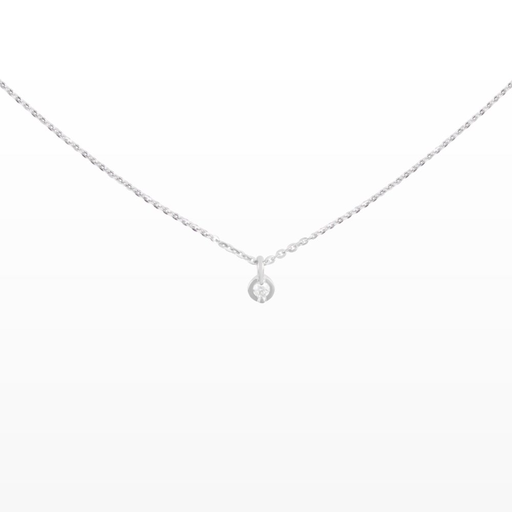 Chiếc dây chuyền mang thiết kế tối giản với mặt dây hình tròn nhỏ nhắn, ôm trọn viên kim cương lấp lánh ở trung tâm. Vẻ đẹp tinh tế của đường tròn mềm mại kết hợp cùng ánh sáng trong trẻo của viên tạo nên tổng thể thanh lịch và cuốn hút.