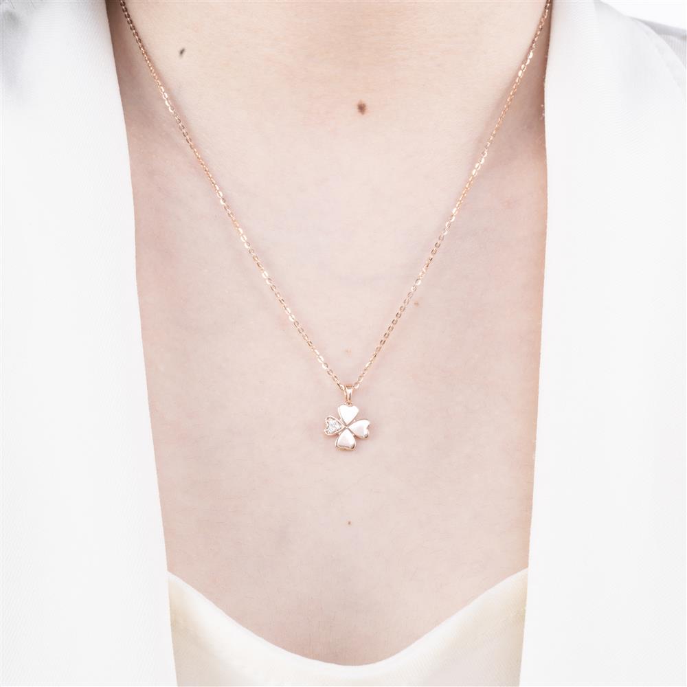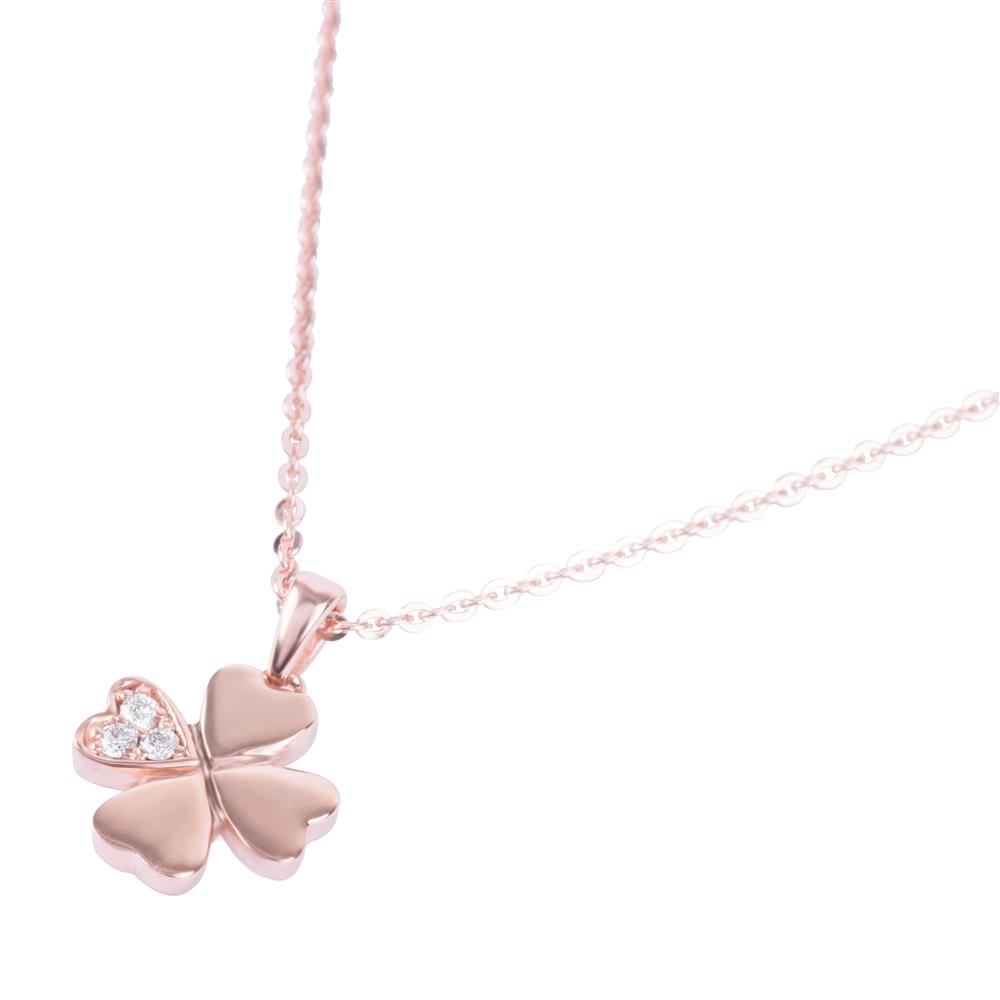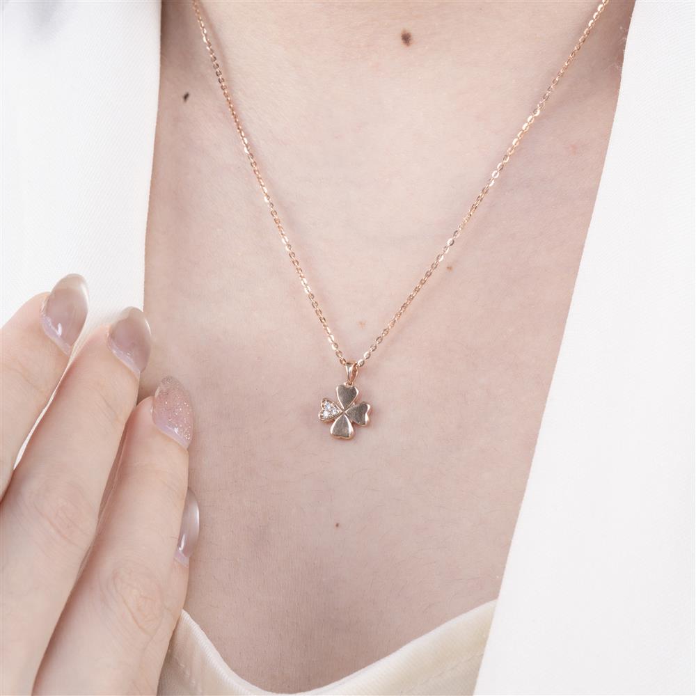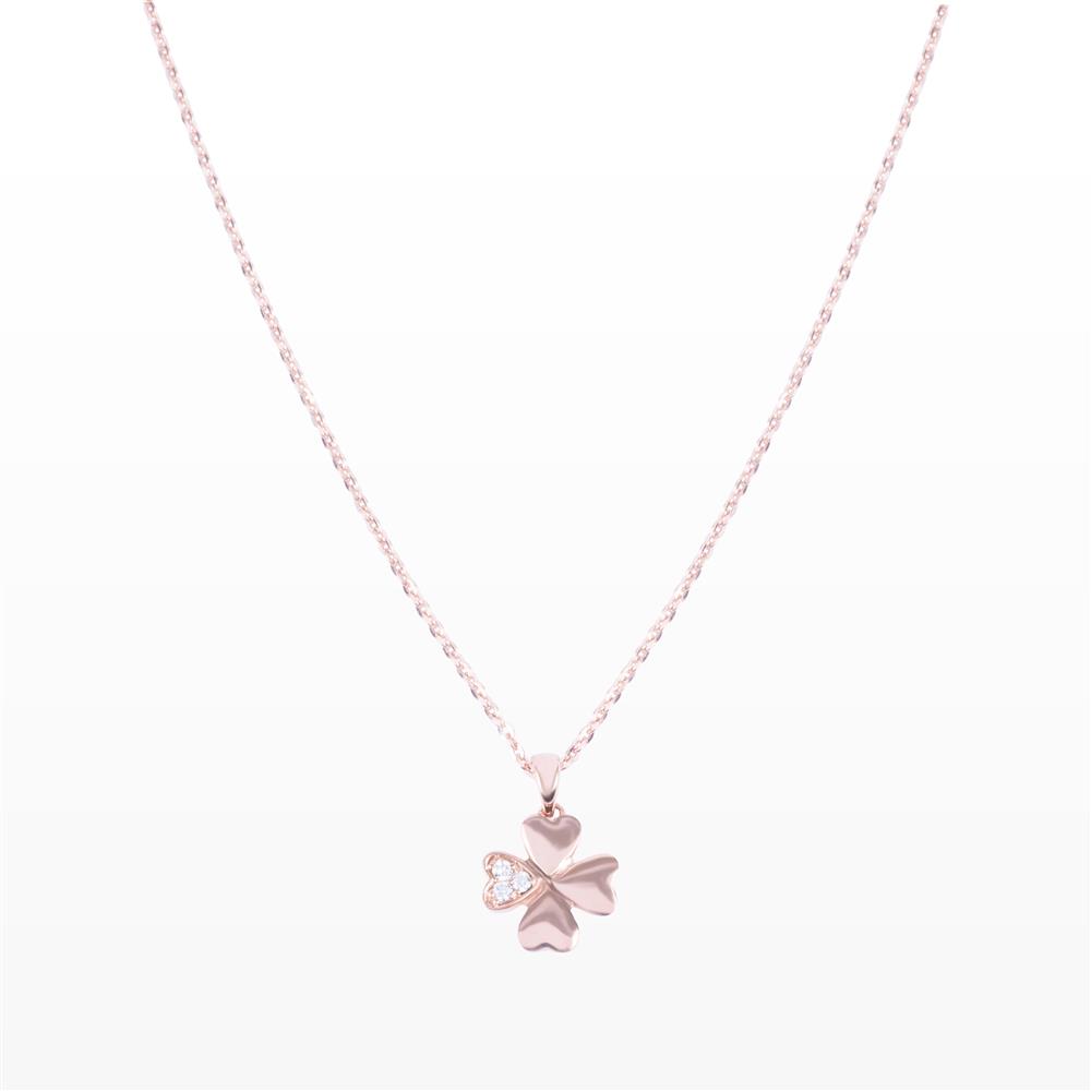 Dây chuyền vàng hồng nổi bật với mặt dây hình cỏ bốn lá – biểu tượng của may mắn và hạnh phúc. Một cánh lá được cách điệu thành hình trái tim, đính ba viên kim cương lấp lánh, tạo điểm nhấn tinh tế và sang trọng. Thiết kế vừa ngọt ngào vừa thanh lịch, là món trang sức lý tưởng để mang lại sự may mắn và niềm vui cho người sở hữu.