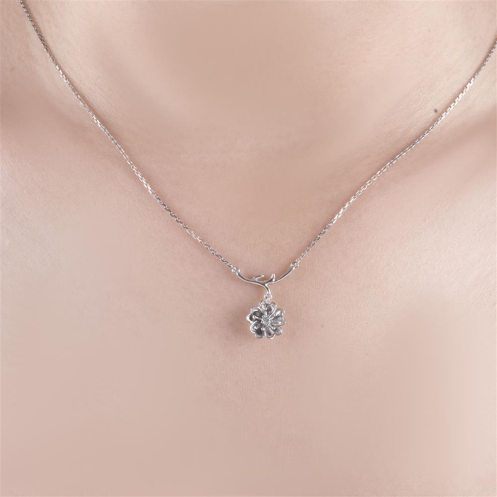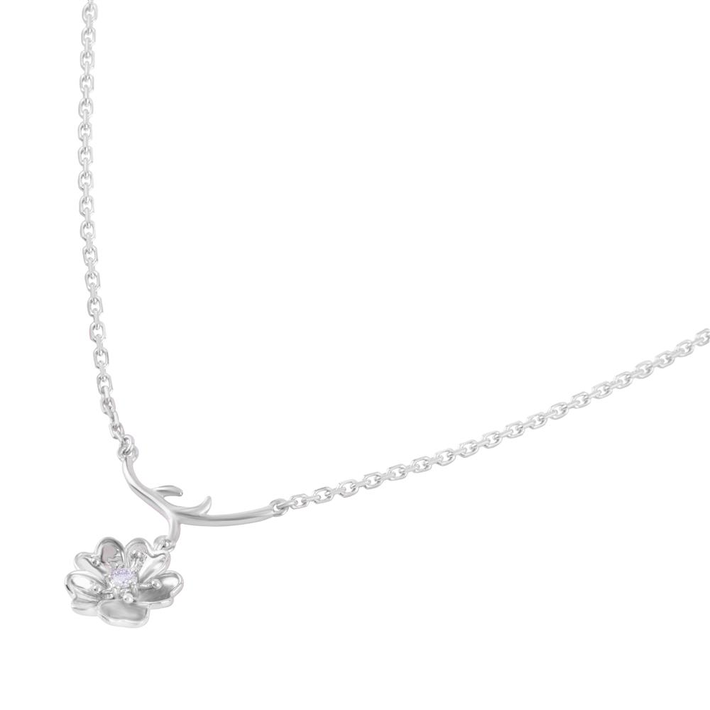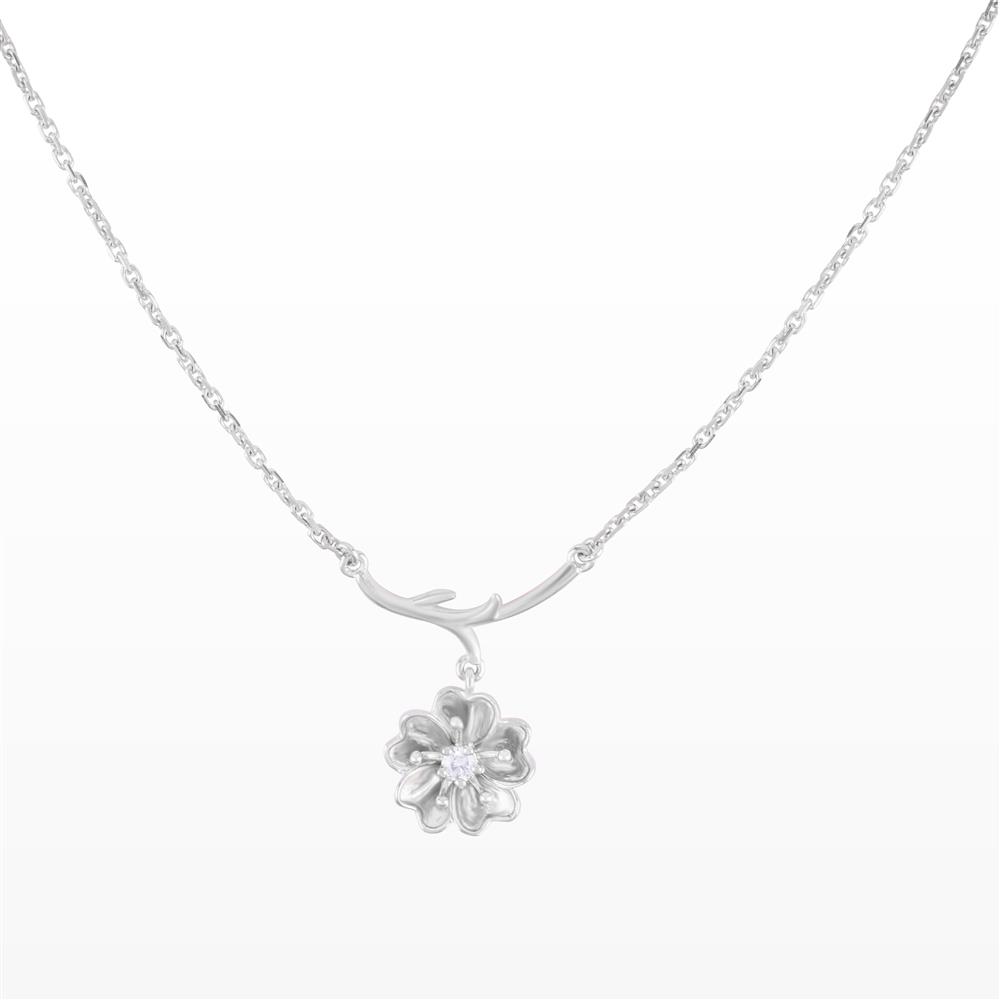 Dây chuyền kim cương sở hữu thiết kế mặt hoa mềm mại, lấy cảm hứng từ vẻ đẹp tinh khôi của thiên nhiên. Những cánh hoa được tạo hình bo tròn uyển chuyển, ôm trọn viên kim cương trung tâm lấp lánh, mang lại hiệu ứng ánh sáng dịu dàng và đầy nữ tính.