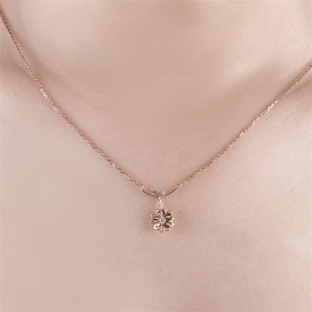 Dây chuyền kim cương sở hữu thiết kế mặt hoa mềm mại, lấy cảm hứng từ vẻ đẹp tinh khôi của thiên nhiên. Những cánh hoa được tạo hình bo tròn uyển chuyển, ôm trọn viên kim cương trung tâm lấp lánh, mang lại hiệu ứng ánh sáng dịu dàng và đầy nữ tính.