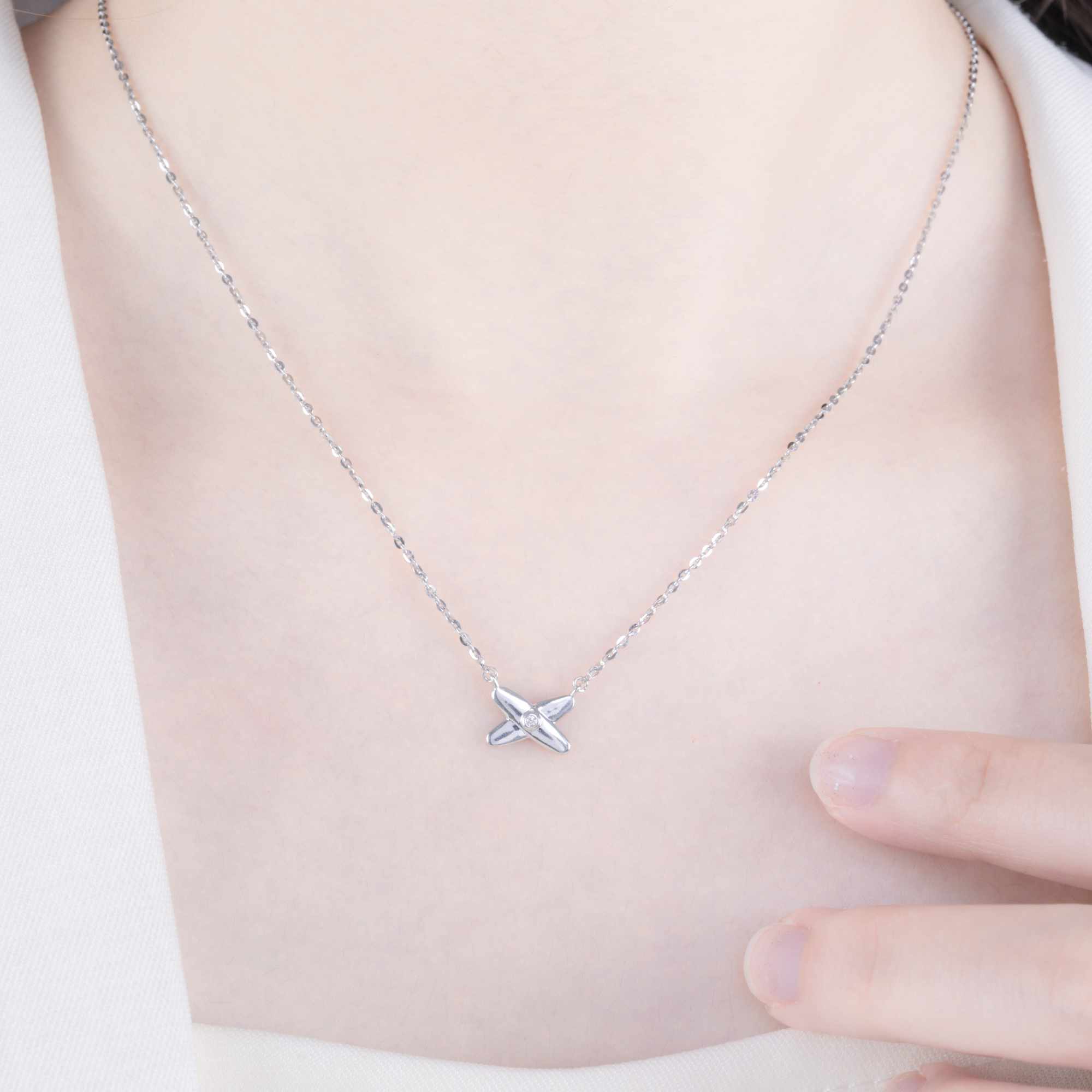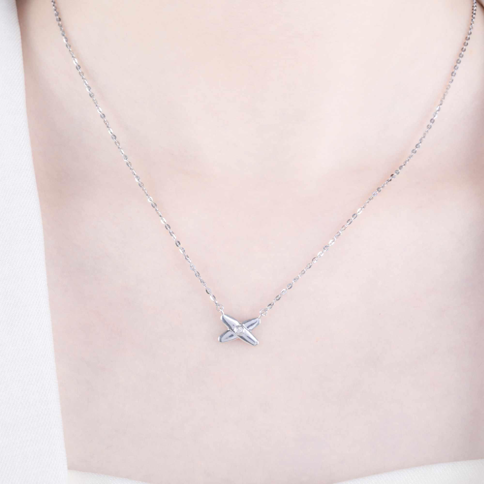 Tinh tế với thiết kế hoa bốn cánh cách điệu, chiếc dây chuyền mang đến vẻ đẹp nhẹ nhàng nhưng đầy cuốn hút. Mỗi cánh hoa được uốn lượn mềm mại, giao thoa tại trung tâm là viên đá sáng lấp lánh – biểu tượng cho sự gắn kết và tỏa sáng từ bên trong.