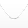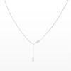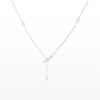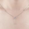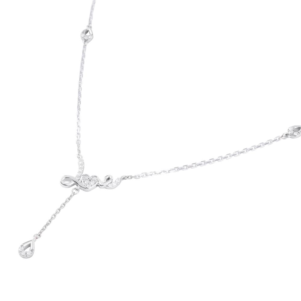 Thiết kế dây chuyền nổi bật với chữ “LOVE” cách điệu mềm mại ở trung tâm, các nét chữ uốn lượn thanh thoát như một lời thì thầm dịu dàng. Từ điểm nhấn chữ LOVE, một sợi dây thả mảnh buông nhẹ xuống, kết thúc bằng mặt giọt nước đính kim cương, tạo hiệu ứng chuyển động tinh tế và đầy cảm xúc.