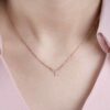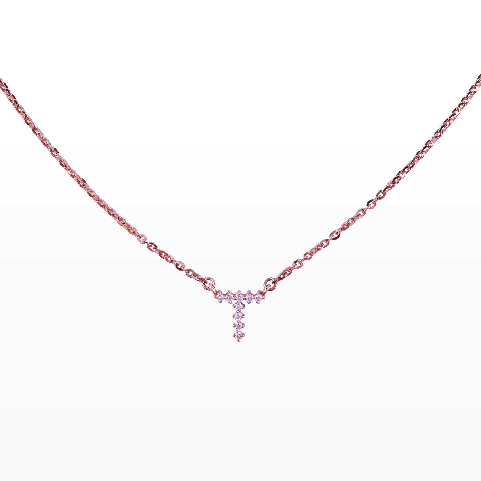 Hình dáng chữ T được tạo nên từ những viên kim cương xếp đều, thanh mảnh và ngay ngắn, như một điểm tựa nhẹ nhàng nằm giữa xương quai xanh. Ánh sáng lấp lánh không phô trương, mà lan tỏa dịu dàng, gợi cảm giác vững vàng, an yên và đầy tin cậy – tựa như một lời nhắc nhở thầm lặng về những giá trị cốt lõi luôn ở bên ta.