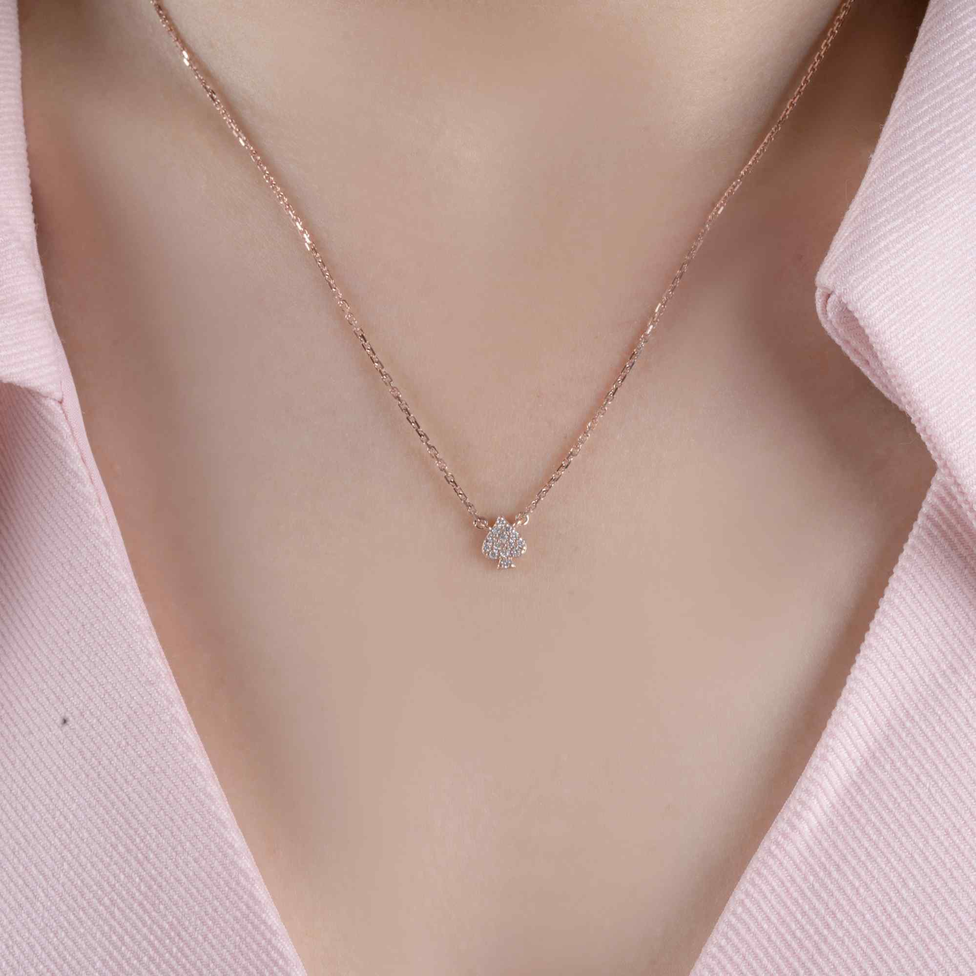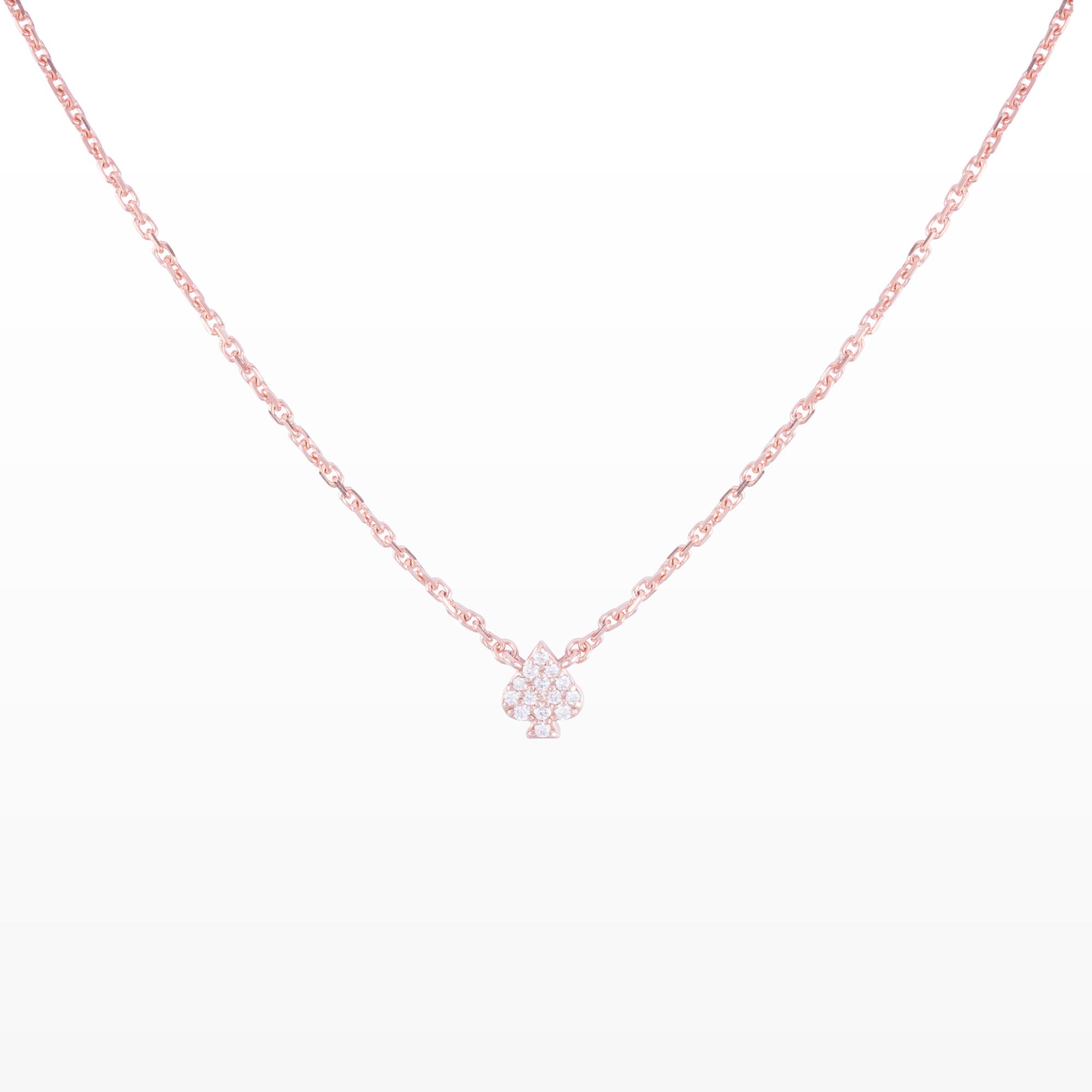 Dây chuyền kim cương Định Lộc mang biểu tượng ♠︎ (bích) – hình ảnh của sự vững vàng, bản lĩnh và những cơ hội đã được “định sẵn” cho người xứng đáng. Mặt dây nhỏ gọn được kết từ nhiều viên kim cương lấp lánh, tỏa sáng tinh tế trên nền vàng hồng ấm áp, tạo nên cảm giác vừa sang trọng vừa gần gũi.