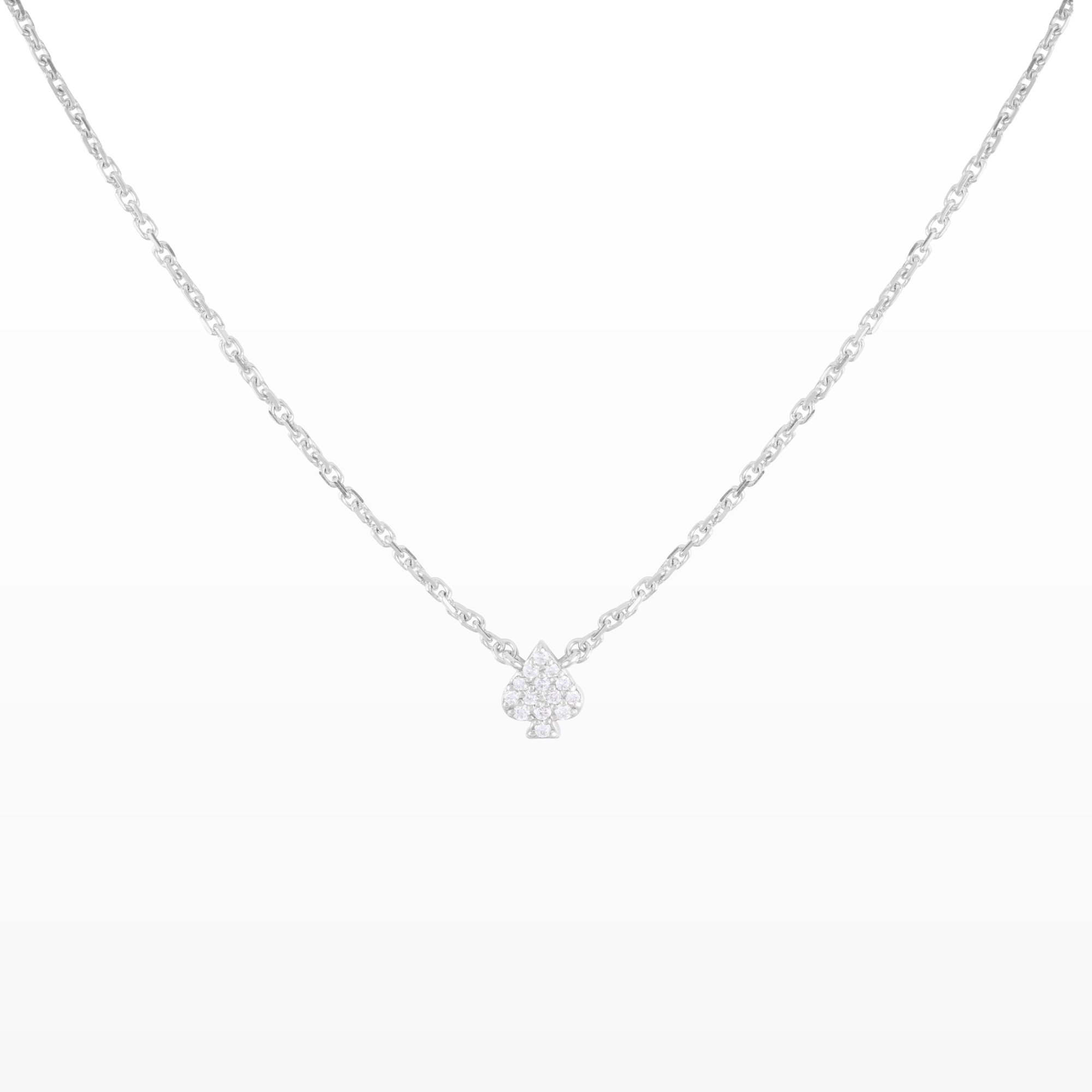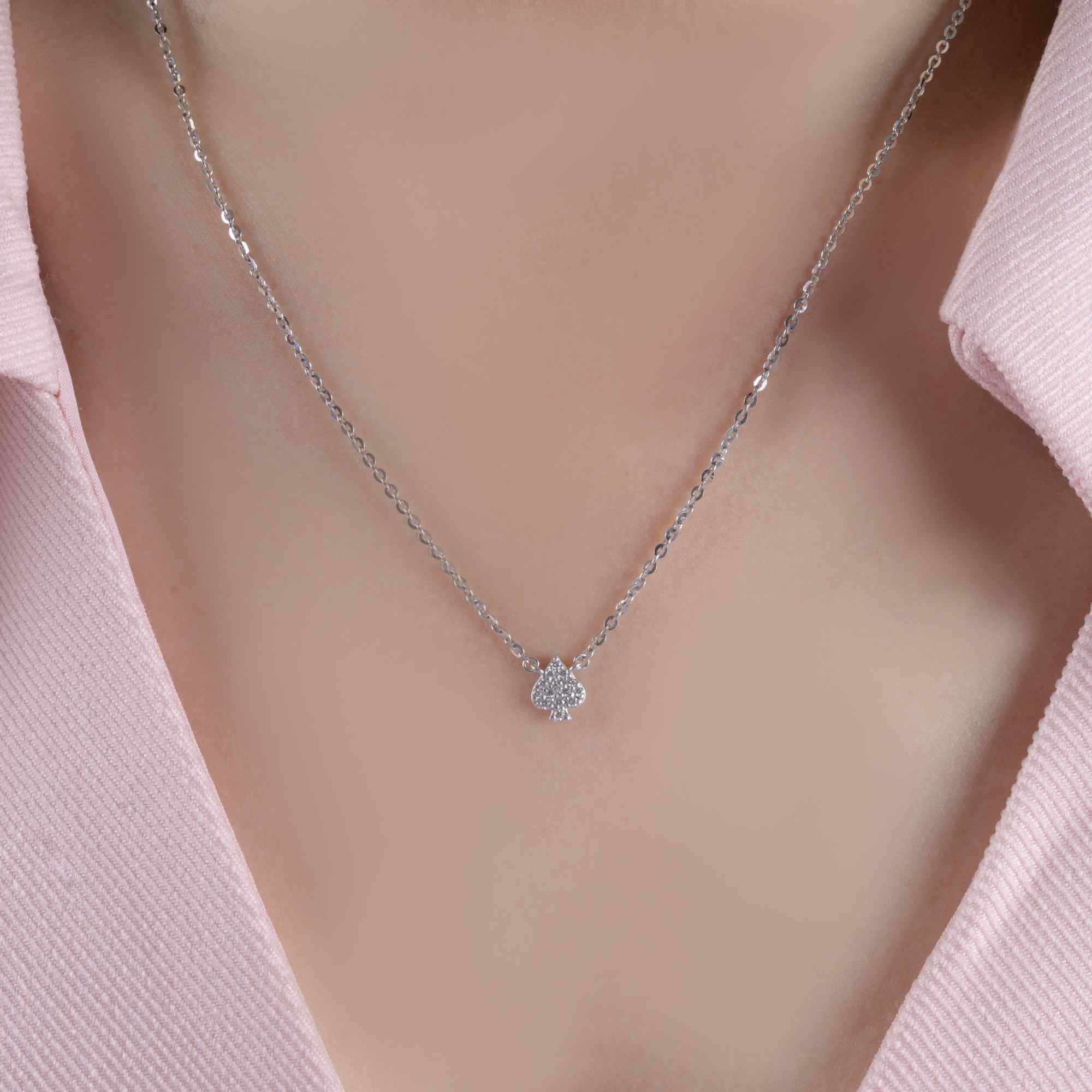 Dây chuyền kim cương Định Lộc mang biểu tượng ♠︎ (bích) – hình ảnh của sự vững vàng, bản lĩnh và những cơ hội đã được “định sẵn” cho người xứng đáng. Mặt dây nhỏ gọn được kết từ nhiều viên kim cương lấp lánh, tỏa sáng tinh tế trên nền vàng hồng ấm áp, tạo nên cảm giác vừa sang trọng vừa gần gũi.