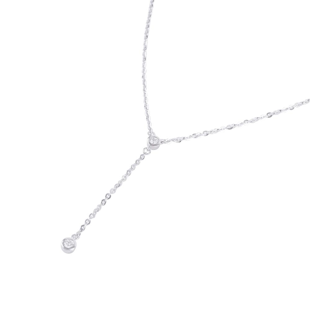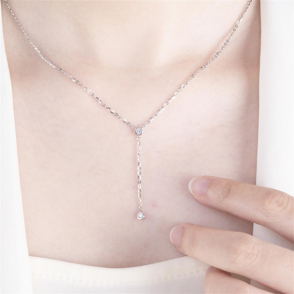 Khi sự tối giản trở thành nghệ thuật, chiếc dây chuyền vàng trắng đính kim cương này là minh chứng hoàn hảo. Hai viên kim cương nhỏ được đính tỉ mỉ trên nền vàng trắng thanh khiết, mang đến ánh sáng dịu dàng nhưng đầy cuốn hút.