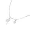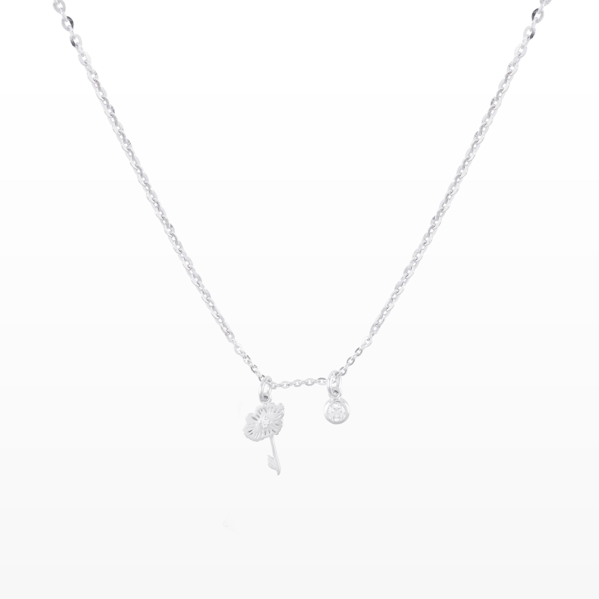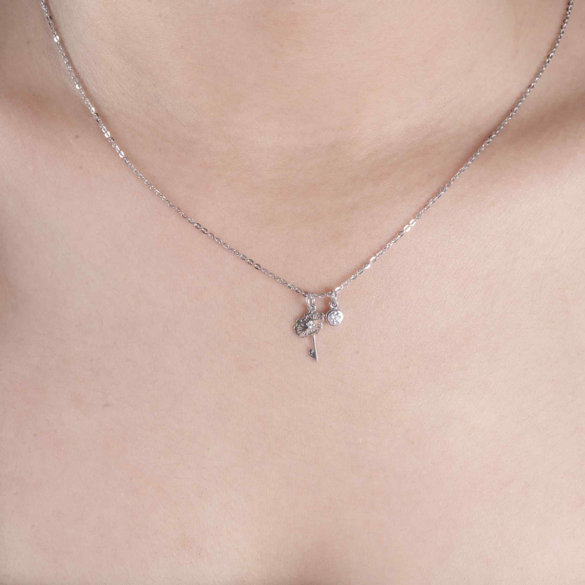 Chiếc dây chuyền mang vẻ đẹp mong manh và tinh tế, với charm hoa nhỏ xinh rủ nhẹ bên cổ, đi cùng viên đá tròn điểm xuyết như một nốt nhạc lấp lánh. Thiết kế tối giản nhưng đầy cảm xúc, gợi lên sự dịu dàng, trong trẻo và nữ tính.