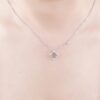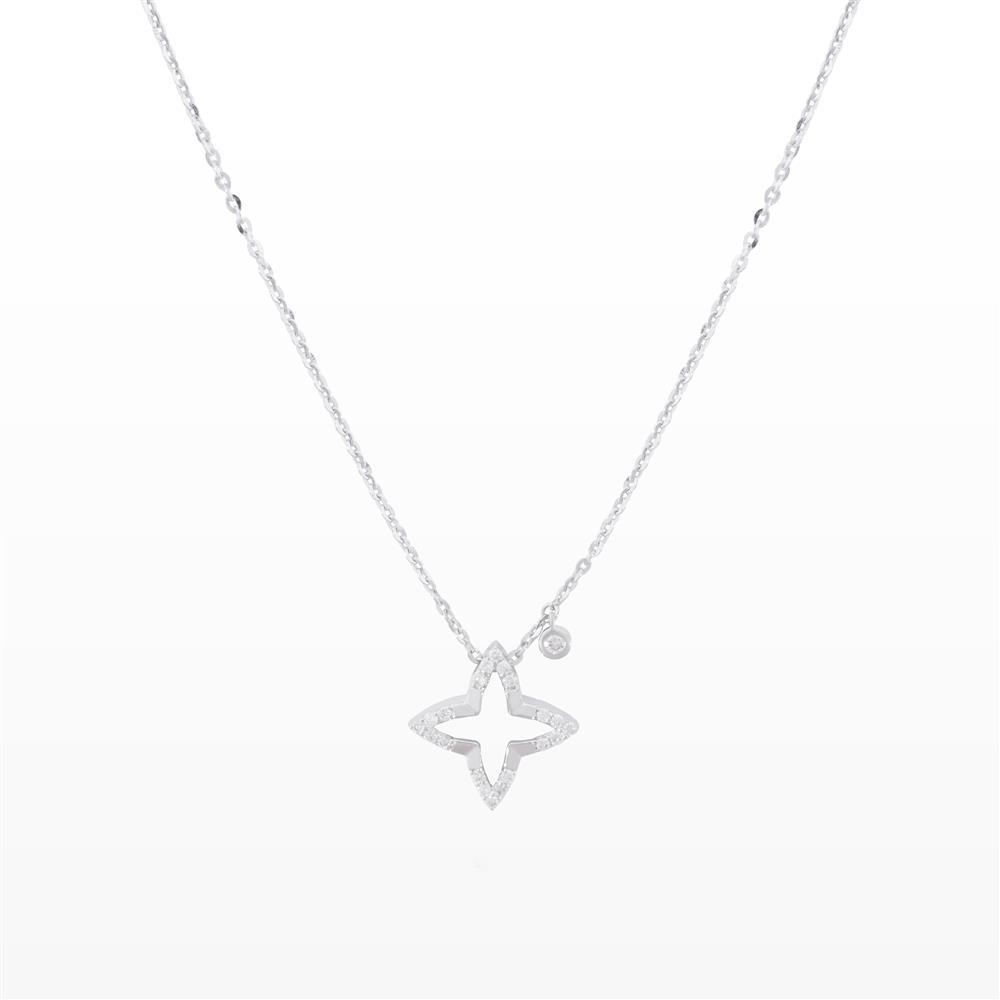Dây chuyền kim cương với mặt bốn cánh rỗng tinh xảo, đường viền điểm xuyết đá nhỏ lấp lánh tạo hiệu ứng nhẹ nhàng nhưng vô cùng sang trọng. Một viên kim cương đơn bên cạnh như điểm sáng dịu, giúp chiếc vòng trở nên tinh tế, nữ tính và nổi bật theo cách rất hiện đại.