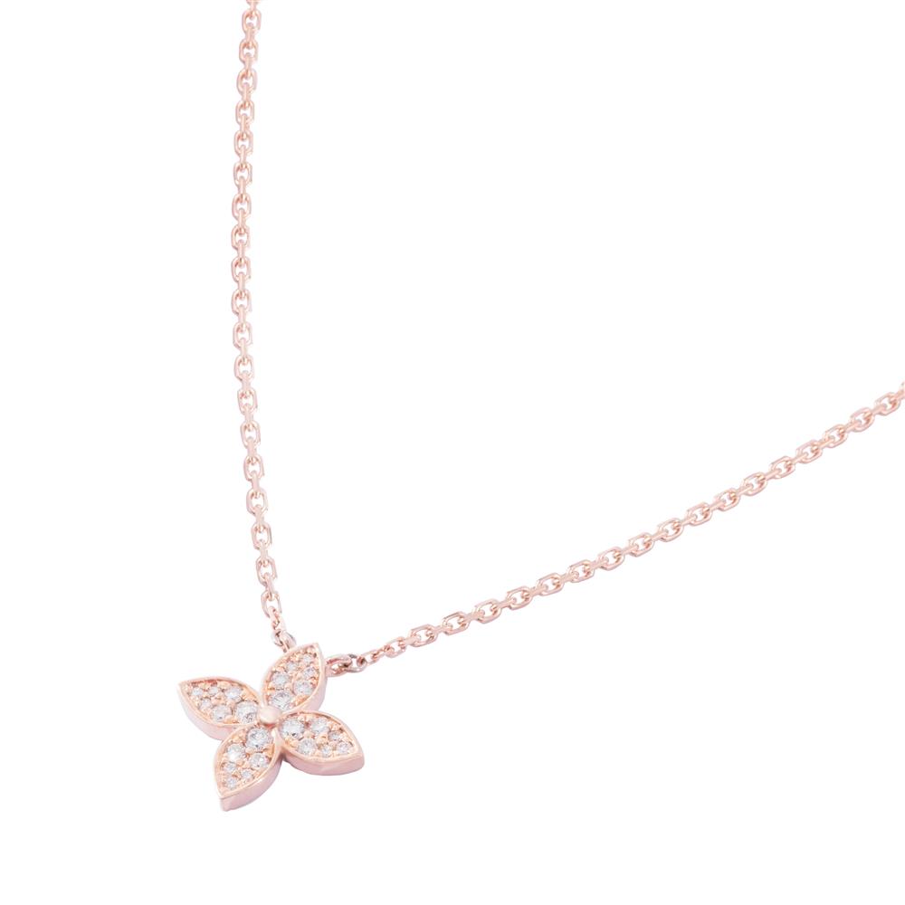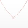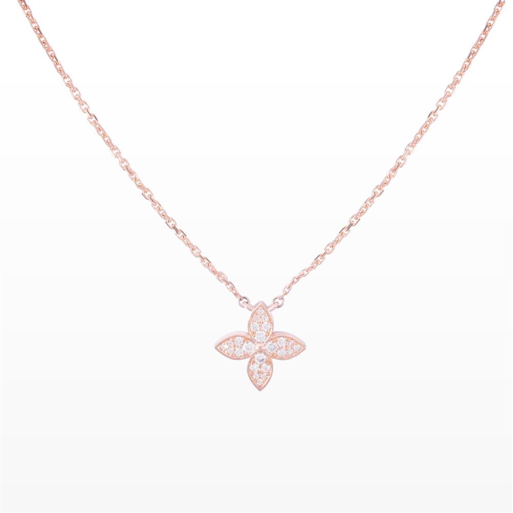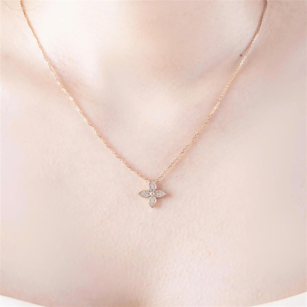 Mẫu dây chuyền hoa bốn cánh được chế tác từ vàng hồng nhẹ nhàng, phối cùng những viên kim cương tinh khiết xếp thành từng cánh hoa lấp lánh. Mỗi viên kim cương phản chiếu ánh sáng theo một cách khác nhau, tạo nên hiệu ứng long lanh như một bông hoa đang nở giữa nắng.