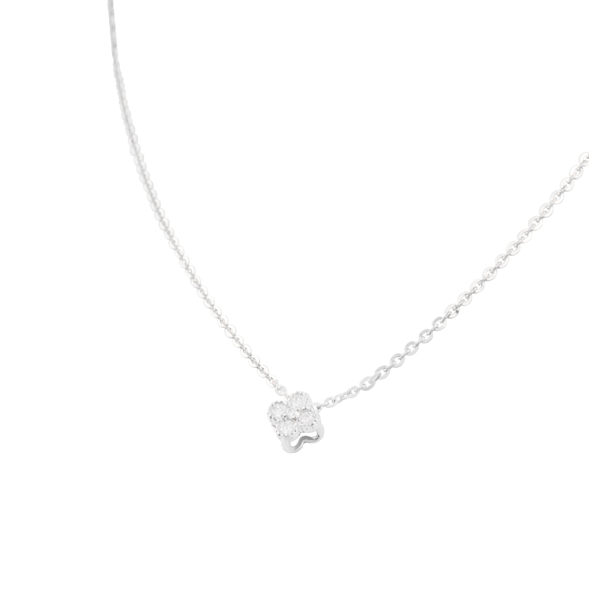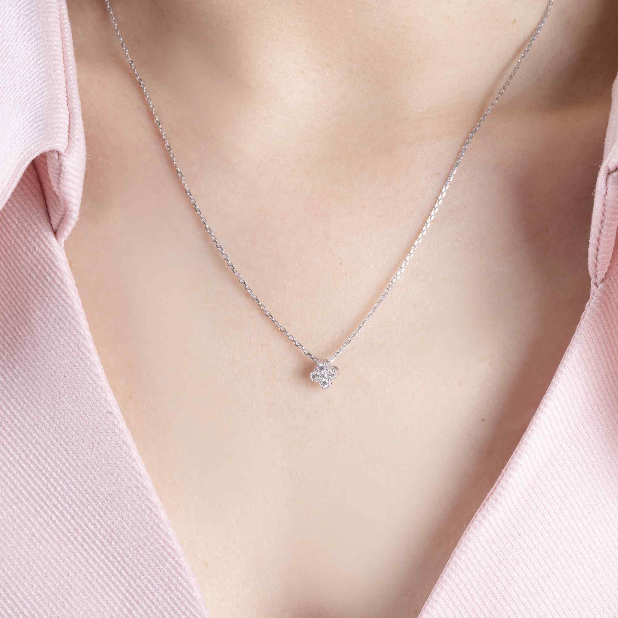 Chiếc dây chuyền được thiết kế với mặt dây hình bông hoa nhỏ xinh, kết hợp từ những viên kim cương lấp lánh được sắp xếp tinh tế tạo nên tổng thể hài hòa và cuốn hút. Ánh sáng phản chiếu từ từng viên kim cương mang lại vẻ đẹp rạng rỡ nhưng vẫn giữ được nét thanh lịch, nhẹ nhàng.