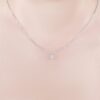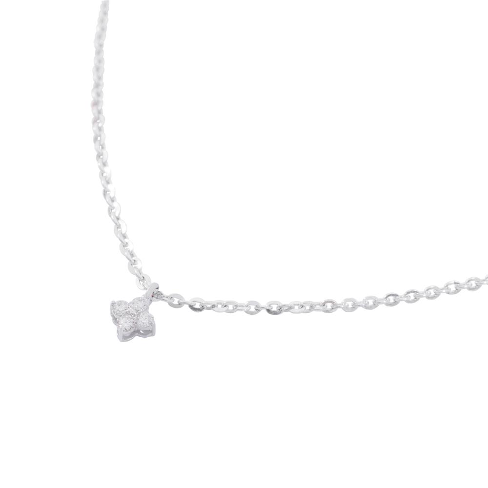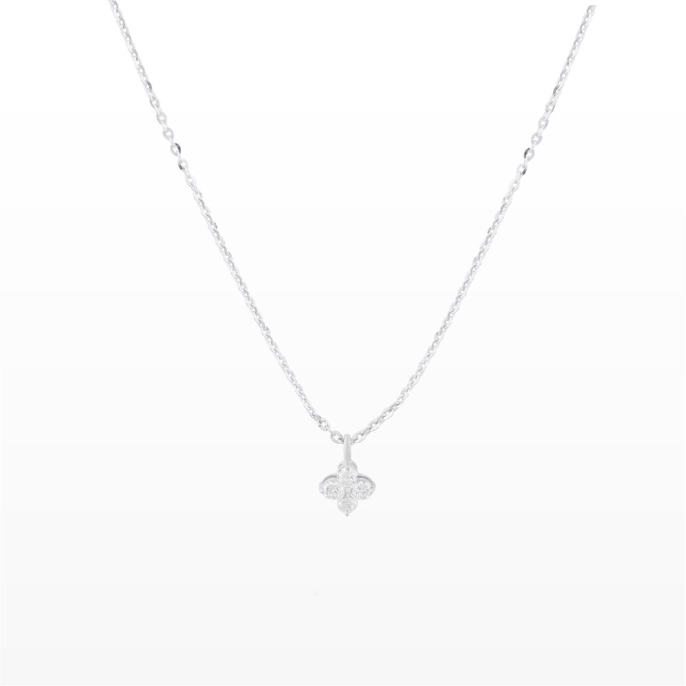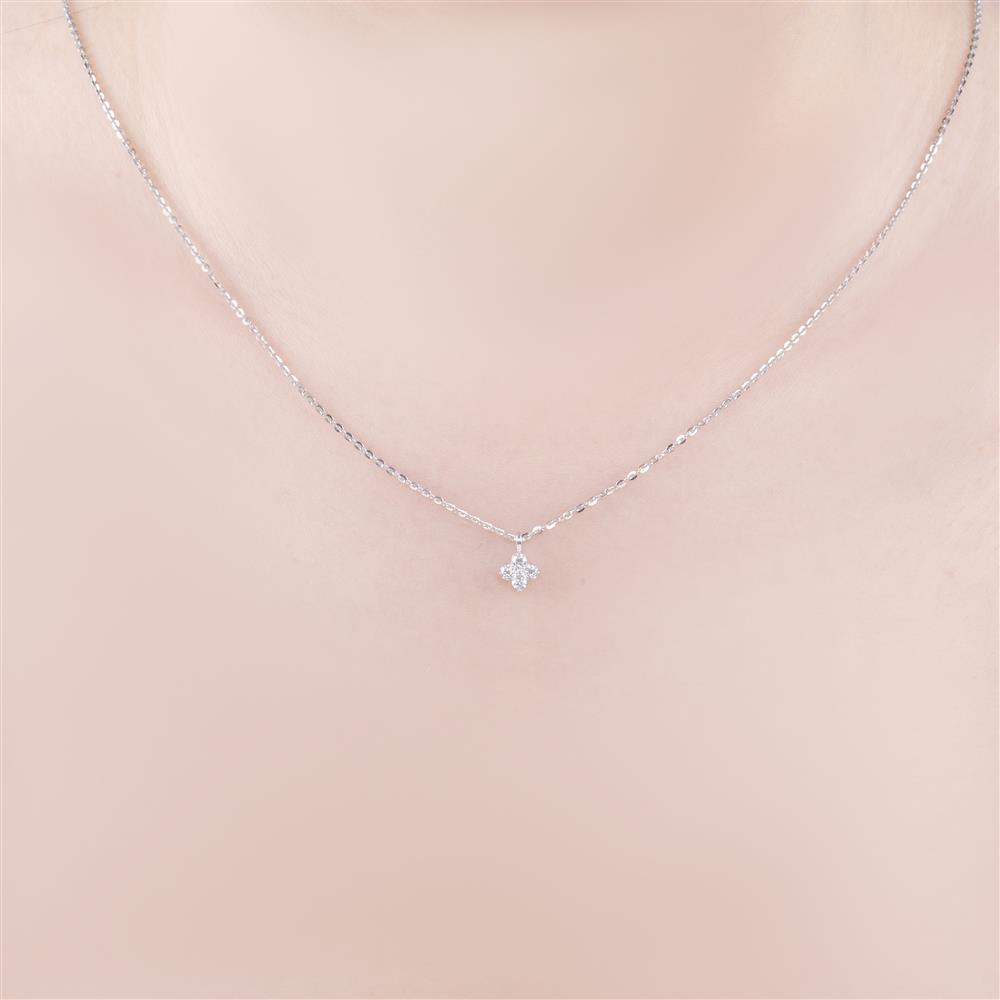 Dây chuyền kim cương với mặt hoa nhỏ xinh như một chấm sáng khẽ đậu trên làn cổ. Thiết kế tối giản đến tinh tế, để từng viên đá li ti tỏa ra ánh sáng trong trẻo như sương mai đọng trên cánh hoa.